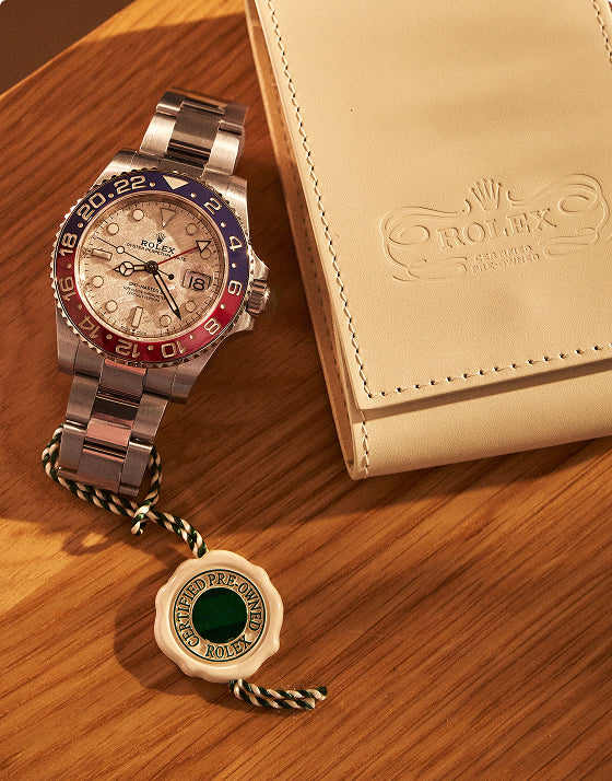 Two hands holding a Rolex submariner watch with the Rolex Certified Pre Owned badge close up