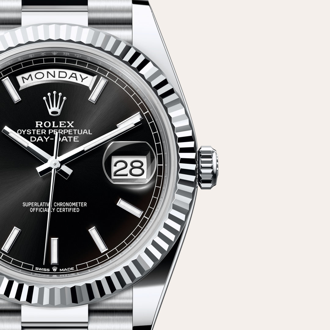 The Rolex fluted bezel is a mark of distinction. Originally, the fluting of the Oyster bezel had a functional purpose: it served to screw the bezel onto the case helping to ensure the waterproofness of the watch. It was therefore identical to the fluting on the case back, which was also screwed onto the case for waterproofness, using specific Rolex tools. Over time, the fluting became an aesthetic element, a genuine Rolex signature feature. Today the fluted bezel is a mark of distinction, in platinum on this Day-Date 40.