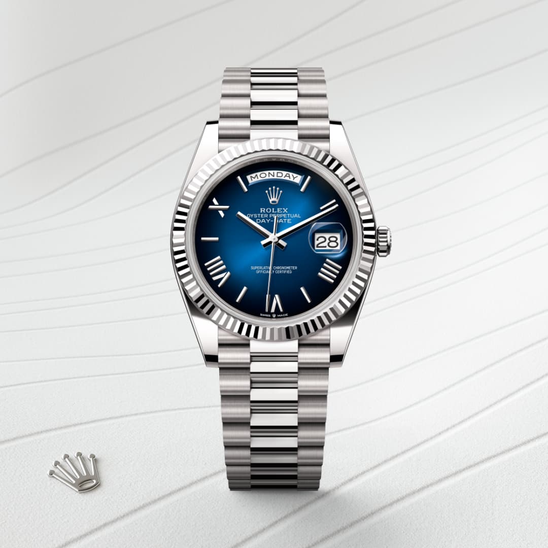 The Rolex fluted bezel is a mark of distinction. Originally, the fluting of the Oyster bezel had a functional purpose: it served to screw the bezel onto the case helping to ensure the waterproofness of the watch. It was therefore identical to the fluting on the case back, which was also screwed onto the case for waterproofness, using specific Rolex tools. Over time, the fluting became an aesthetic element, a genuine Rolex signature feature. Today the fluted bezel is a mark of distinction, in gold on this Day-Date 40.