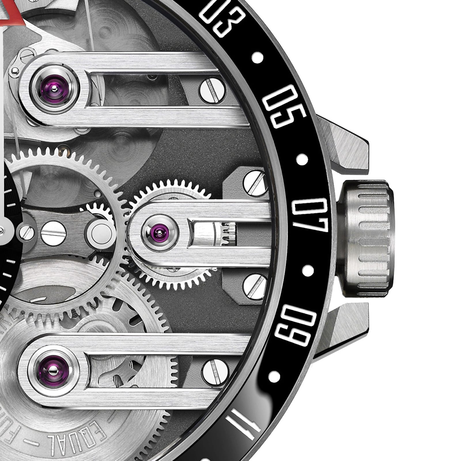 Armin Strom has completely reinterpreted the ubiquitous date function in the Orbit, the world’s first watch with an on-demand date indicated on the bezel. Crafted in steel with a ceramic bezel and an integrated steel bracelet, the Orbit adds a sporty touch to the first-of-its-kind column-wheel retrograde date atop the micro-rotor automatic movement with a torque-limiting barrel for optimal chronometric performance throught the watch’s autonomy.