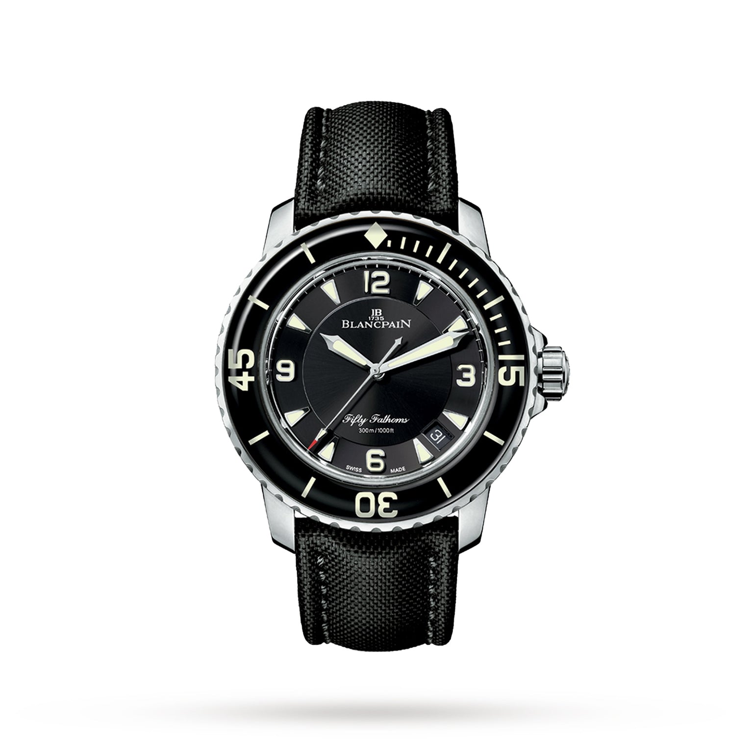 Fifty Fathoms - a passion for the underwater world Presented in a robust 45mm steel case Powered by the 1315 automatic movement for flawless precision Equipped with an impressive 120-hour power reserve Water resistance to 30 bar (300 metres) AESTHETIC EXCELLENCE MEETS PURE PERFORMANCE This spirited collection embodies Blancpain’s passion for the underwater world, originating from the presentation of the first modern diver’s watch in 1953. Today, the collection retains the core signature elements that established the legendary model as the archetypal diver’s watch, updated with innovative materials and new technical solutions to push boundaries and meet even the most sophisticated diving needs. A CANVAS OF ELEGANCE This robust timepiece is presented in a 45mm steel case, housing the powerful 1315 calibre automatic movement within. A unidirectional rotating bezel frames the distinctive black dial. Bold, luminescent hour markers and tapered hands allow for complete visibility in all conditions, while a date window sits between the 4 o’clock and 5 o’clock positions. Paired with a black sail-canvas strap and secured with a folding clasp, this timepiece is enhanced by a 120-hour power reserve and water resistance up to 30 bar (300 metres).