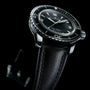 A close-up of the Blancpain Fifty Fathoms Automatique shows its 45mm steel case, black dial with luminous markers, and textured black strap set against a black background.