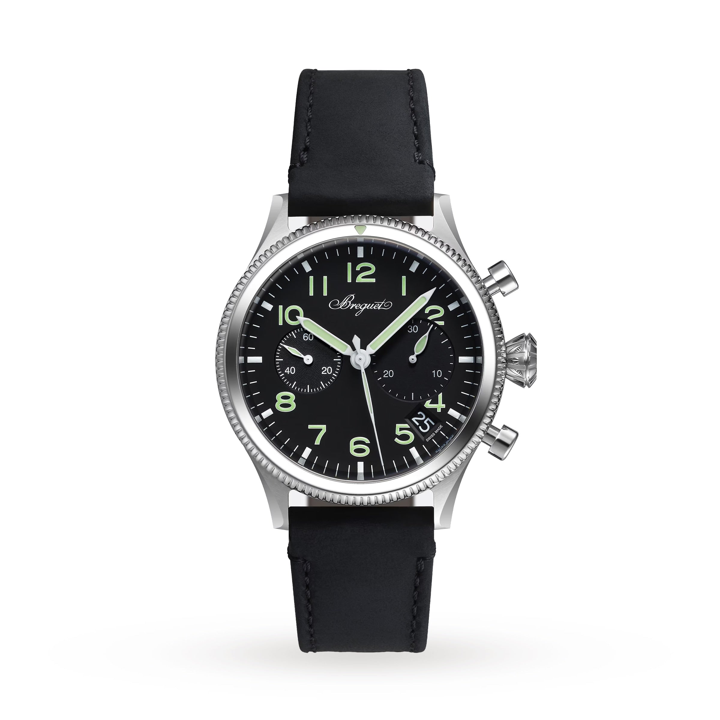 The Breguet Type 20 Chronographe 2057 features a black leather strap, black dial with luminous hands and numerals, silver case, two side pushers, self-winding movement, and displays the Breguet brand name on the dial.