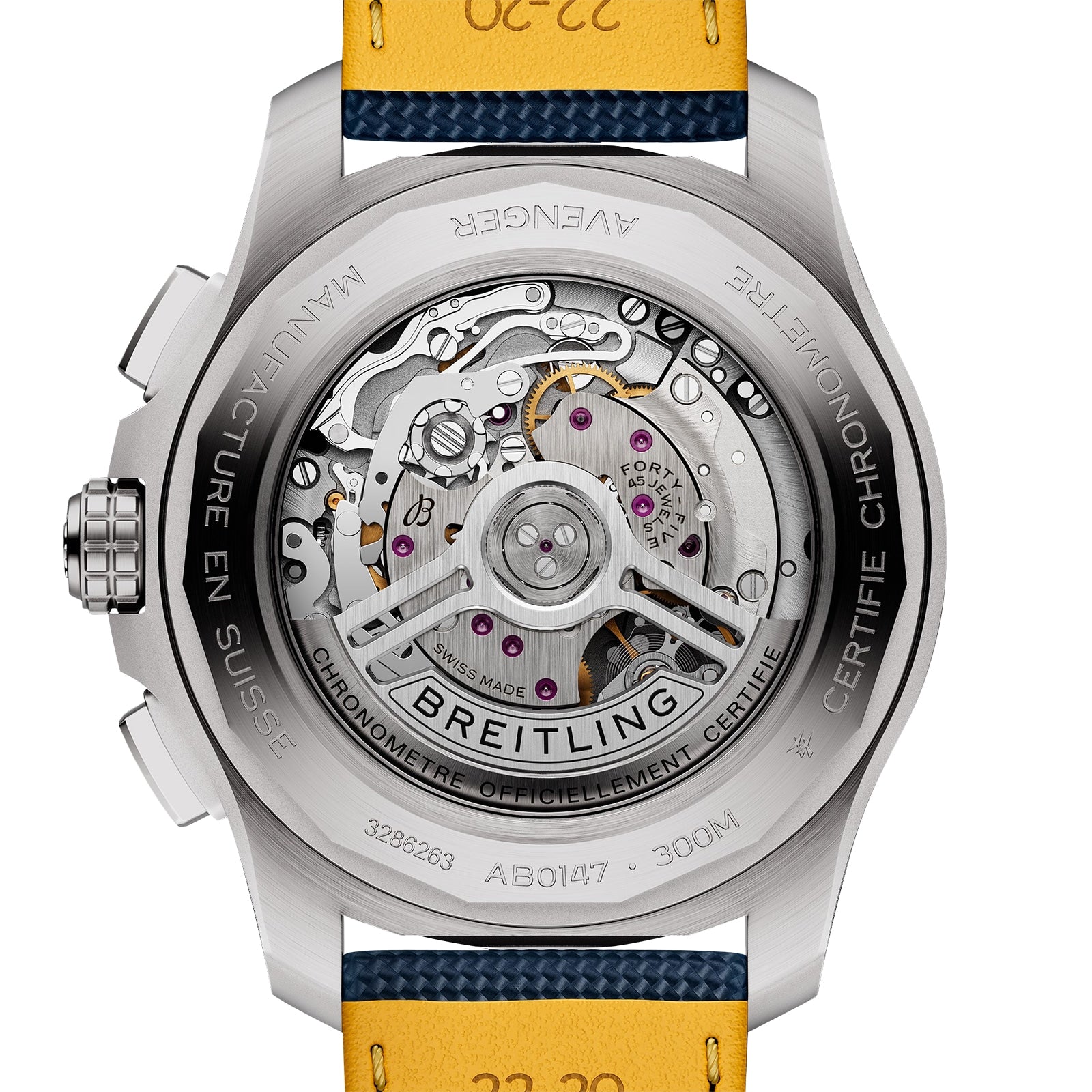 Close-up of the back of the Breitling Avenger B01 Chronograph 44, showing its self-winding mechanical movement through the transparent case back.