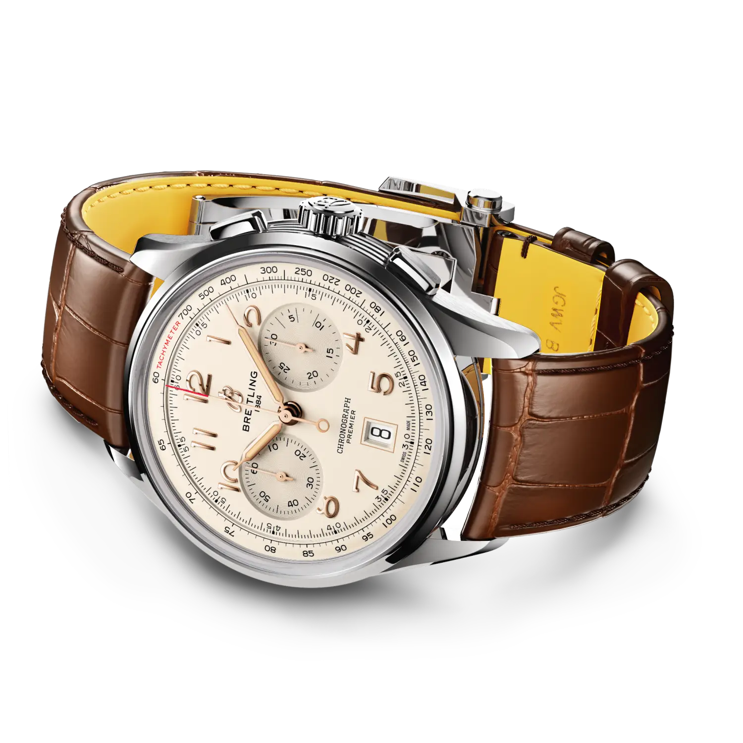In the 1940s, Willy Breitling already envisioned a future after the war filled with hope and opportunity. His vision led him to design the Premier, a functional yet elegant chronograph that exudes impeccable taste. The modern Premier, with its vintage-inspired details such as the smooth fixed bezel, twin-register dial, and applied Arabic numerals, is available ina variety of colors and materials. Whether worn with a classic alligator leather strap or a sleek metal bracelet, the Premier B01 Chronograph 42 boasts the uncompromising technical standards of Willy Breitling. Its self-winding movement, the COSC-certified Breitling Manufacture Caliber 01, guarantees precision, reliability, and functionality. Experience the passion and excellence of the Premier today.