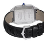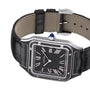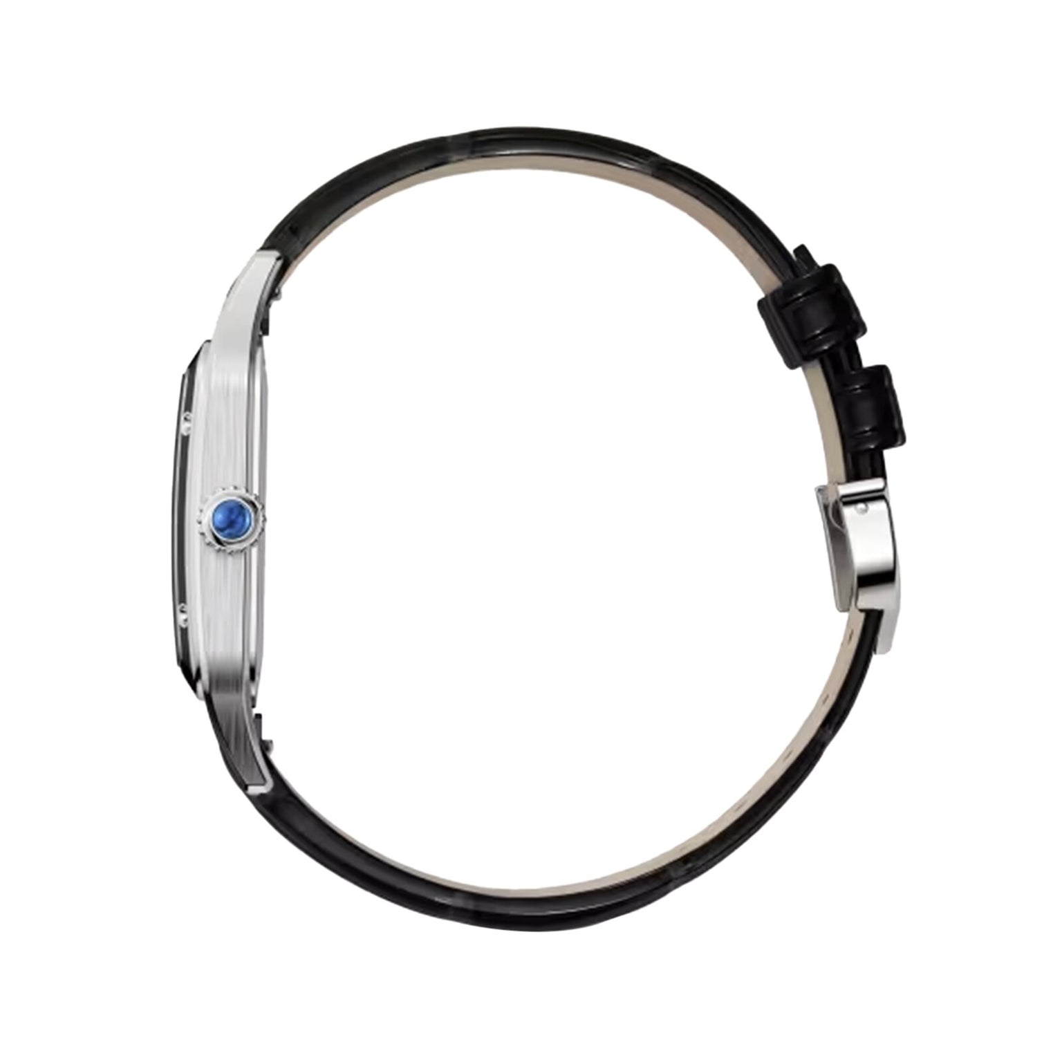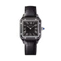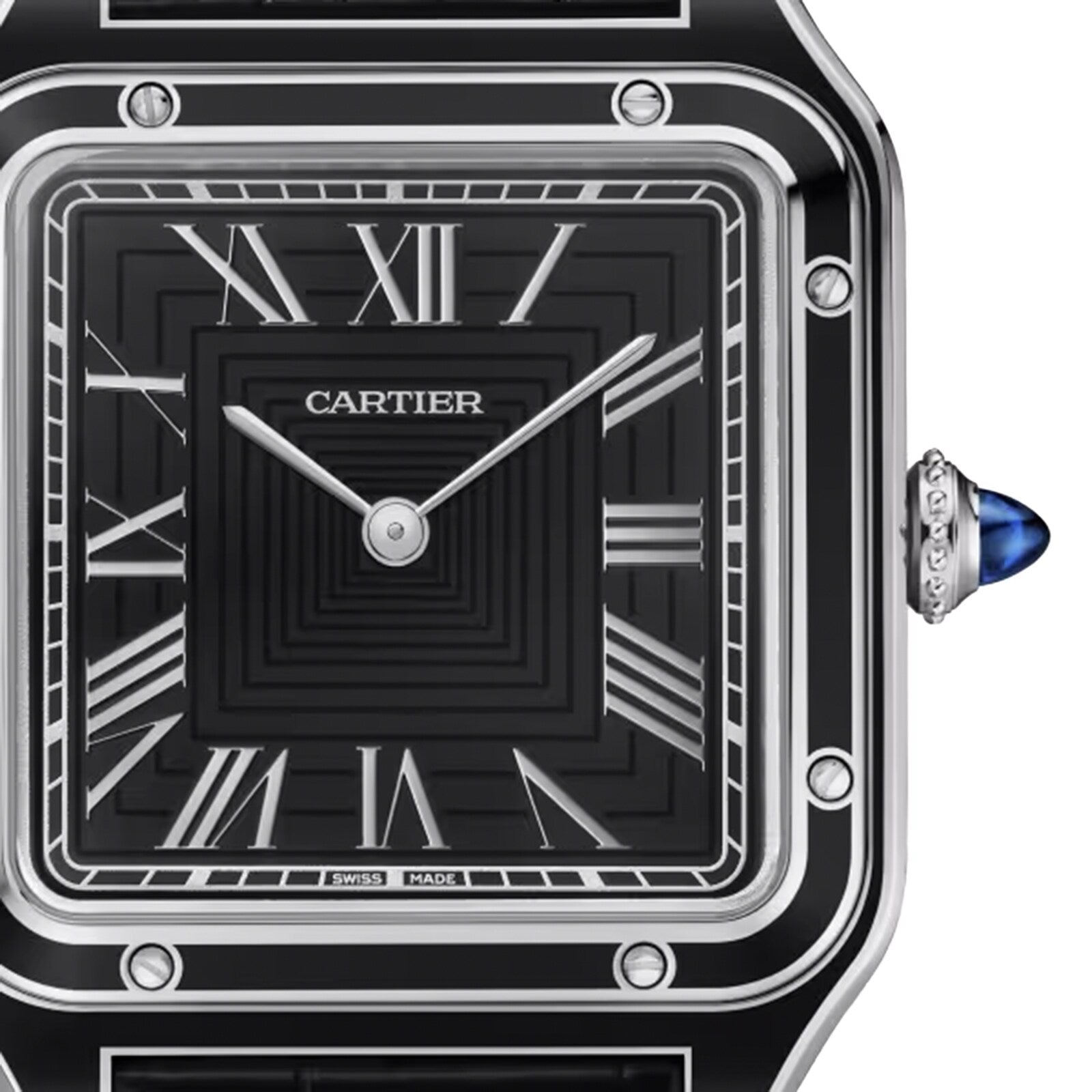 Santos-Dumont watch, large model, Manufacture mechanical movement with manual winding, calibre 430 MC. Steel case with black lacquer, steel beaded crown set with a blue synthetic spinel cabochon, black square decoration dial with translucent lacquer, Roman numerals, steel sword-shaped hands, sapphire crystal. Case back engraved with the handwritten signature of Alberto Santos-Dumont. Black alligator-skin strap, steel ardillon buckle. Case dimensions: 43.5 mm x 31.4 mm, thickness: 7.3 mm. Water-resistant up to 3 bar (approx. 30 metres).