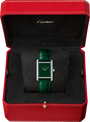 Tank Must watch, large model, quartz movement. Steel case, beaded crown set with a synthetic cabochon-shaped spinel, green lacquered dial, polished steel sword-shaped hands, green alligator-skin strap, steel ardillon buckle. Case dimensions: 33.7 mm x 25.5 mm, thickness: 6.6 mm. Water-resistant to 3 bar (approx. 30 metres).