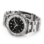 The Breitling Avenger B01 Chronograph 42 is a stainless steel watch with a black dial, three subdials, aviation-inspired design, date window at 6 o’clock, and metal link bracelet.