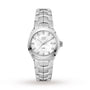 The TAG Heuer Link Date wristwatch features a silver S-shaped bracelet, a white mother-of-pearl dial, diamond hour markers, and a date display at 3 oclock.