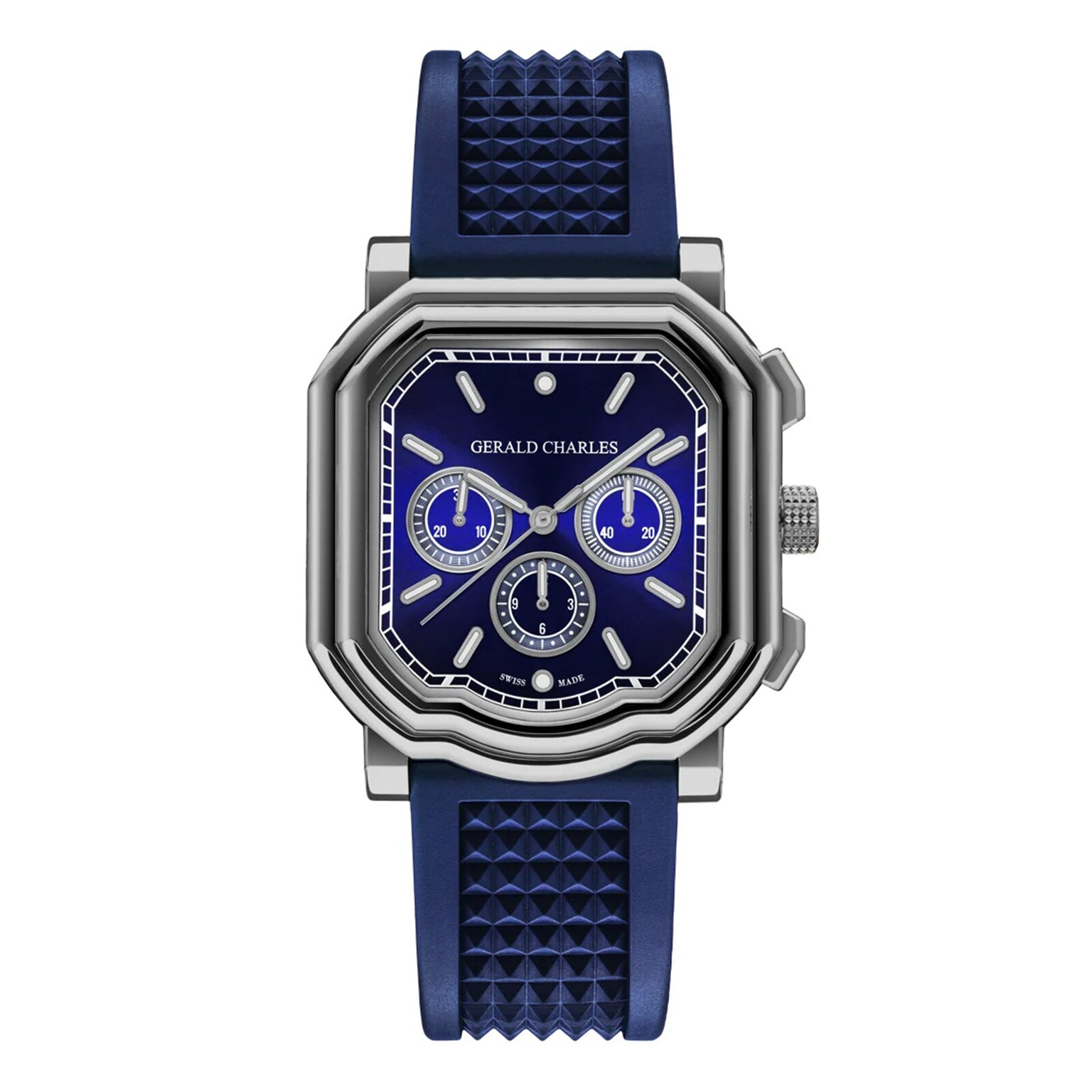 The Gerald Charles Maestro 3.0 Chronograph features a blue dial with Super-LumiNova markers, three subdials, silver accents, a geometric-patterned strap, and a silver case, displayed against a white background.