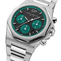 The Girard-Perregaux Laureato Chronograph 42 features a silver stainless steel bracelet and a green and black chronograph dial.