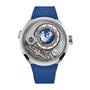 The Greubel Forsey GMT Balancier Convexe is a luxury wristwatch with a blue strap, silver face, rotating globe, and exposed mechanical gears.