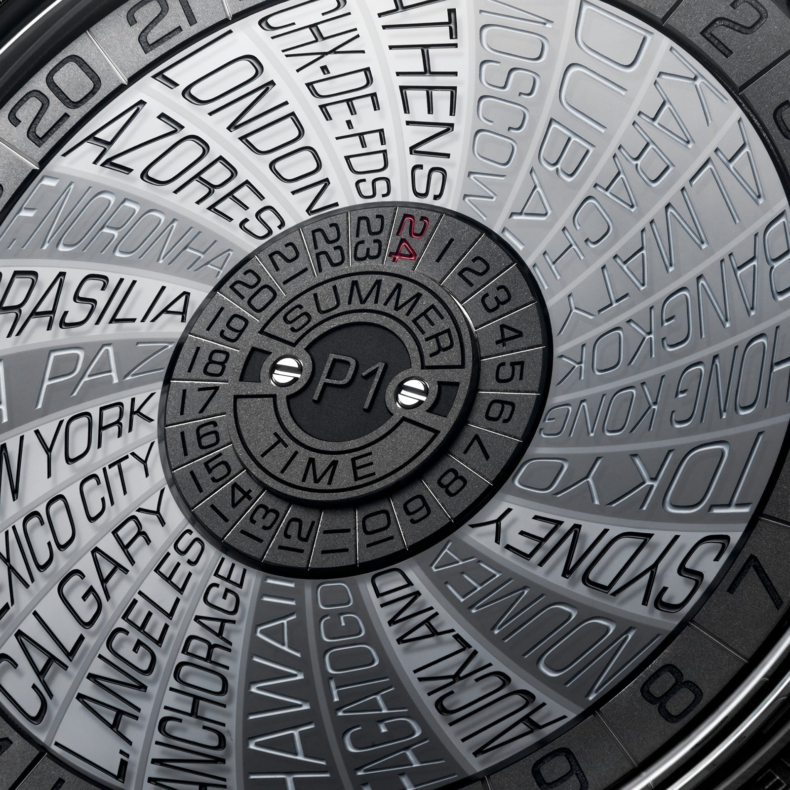 Close-up of the Greubel Forsey GMT Balancier Convexe watch face featuring world cities and time zones in a modern, metallic design.
