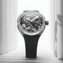 The new diameter of 41.5 mm has been specifically designed for carbon. It’s a radical change, immediately visible on the wrist. This timepiece is tighter, livelier, and even more modern. The very dark tone of the carbon reinforces the feeling of a very compact piece, while staying open to display the movement, complication and finishes.