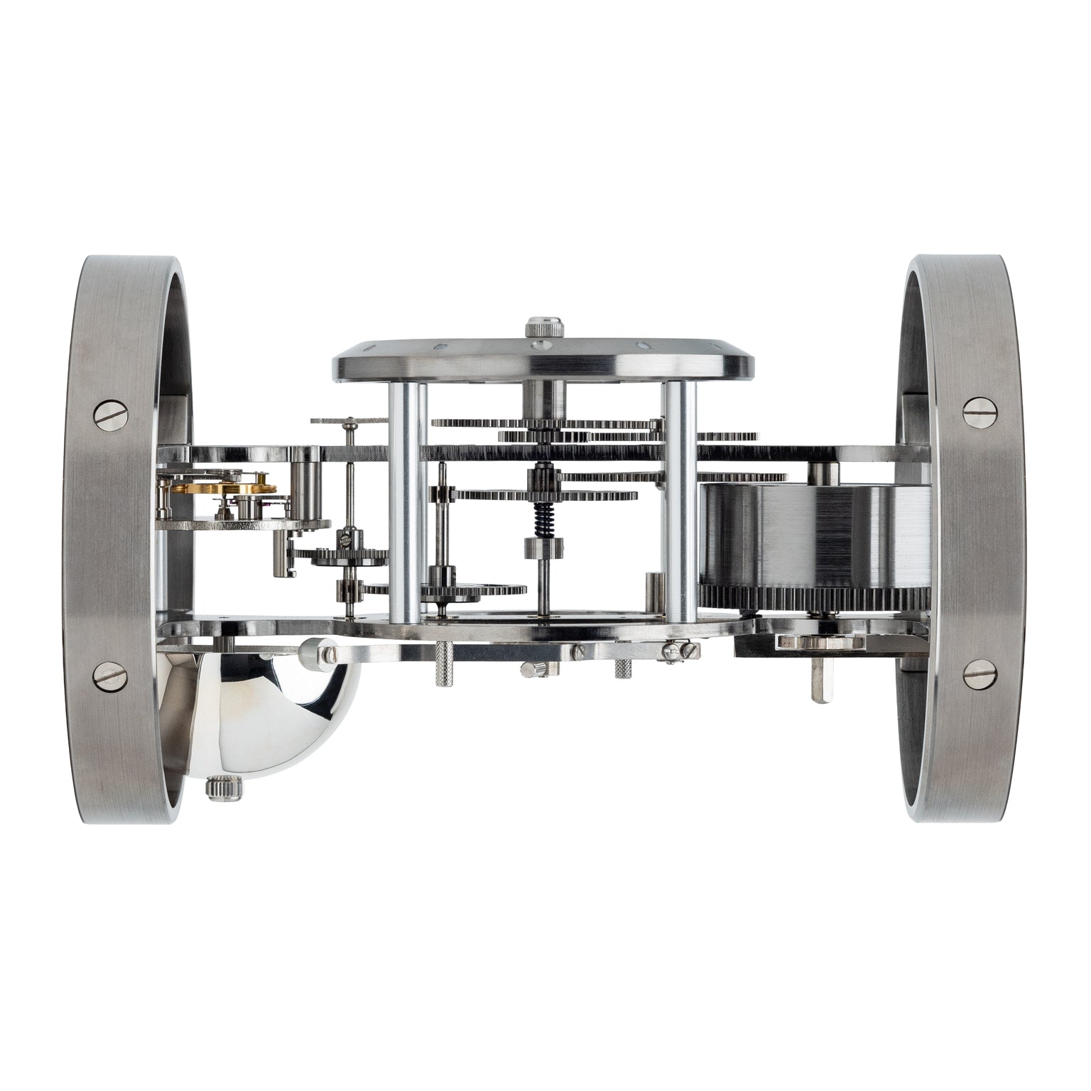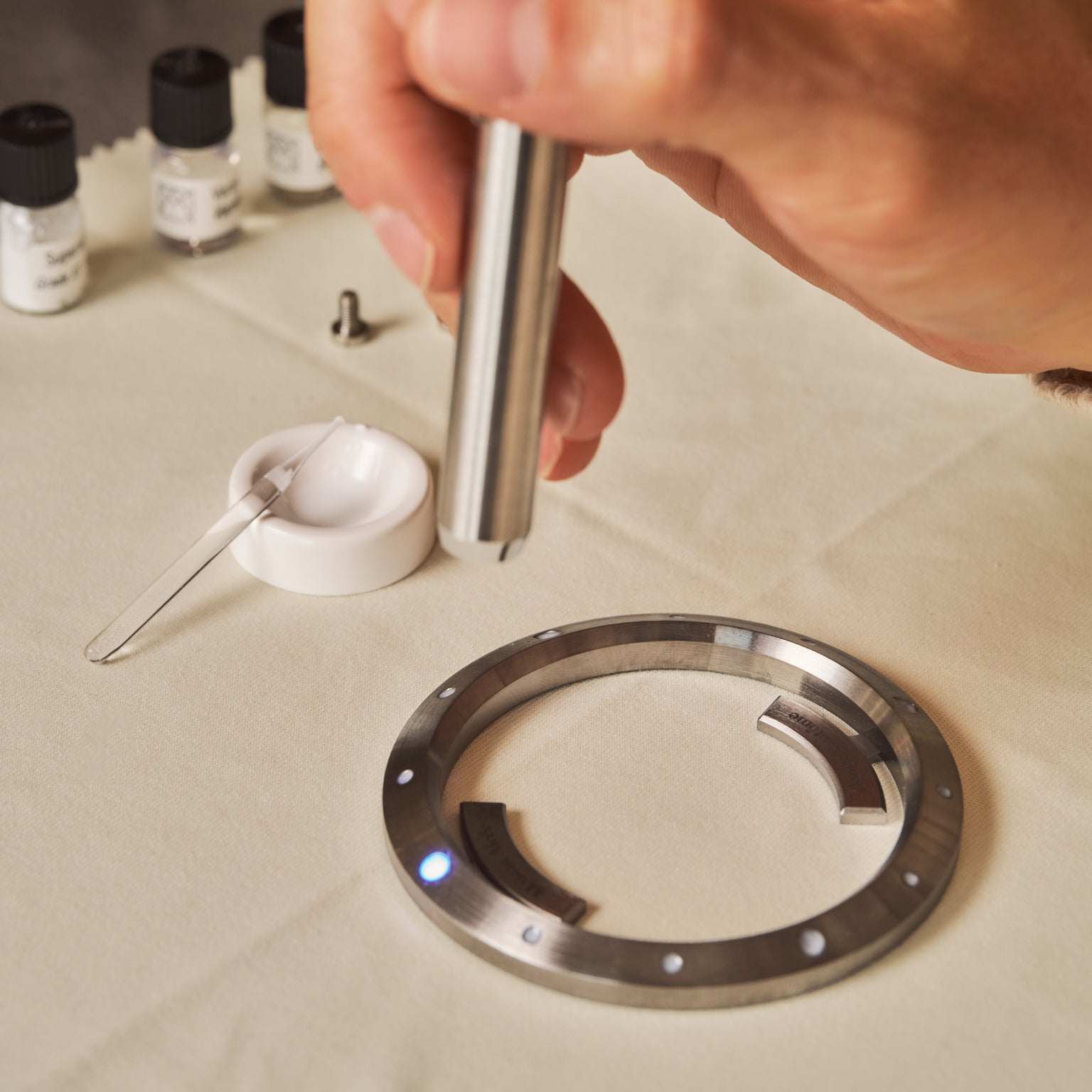 For the Hodinkee Limited Edition, we worked closely with Benoît and Alcée to create a version that celebrates that same spirit of education, while also incorporating several details that are entirely exclusive. The stainless steel base has been treated with a ruthenium coating, giving the clock a darker, moodier tone that echoes our signature Hodinkee Grey color and ties this special Persée Fantôme to our aesthetic. These grey tones are interrupted only by the perfectly polished finish of the striking bell, which chimes on the hour when activated. The custom syringe handset, exclusive to Hodinkee, has been re-engineered to be luminous, and — in a delightful twist — it arrives unpainted, allowing you to finish the job yourself. Finally, the outer dial has also been prepared with luminous treatment, and once again, you apply the lume by hand. It’s a reminder that in this project, your effort, your craftsmanship, and your patience become part, a glowing part, of the clock itself. All of these details add up to a piece that is both subtle and striking, depending on where it’s placed in the owner’s home.