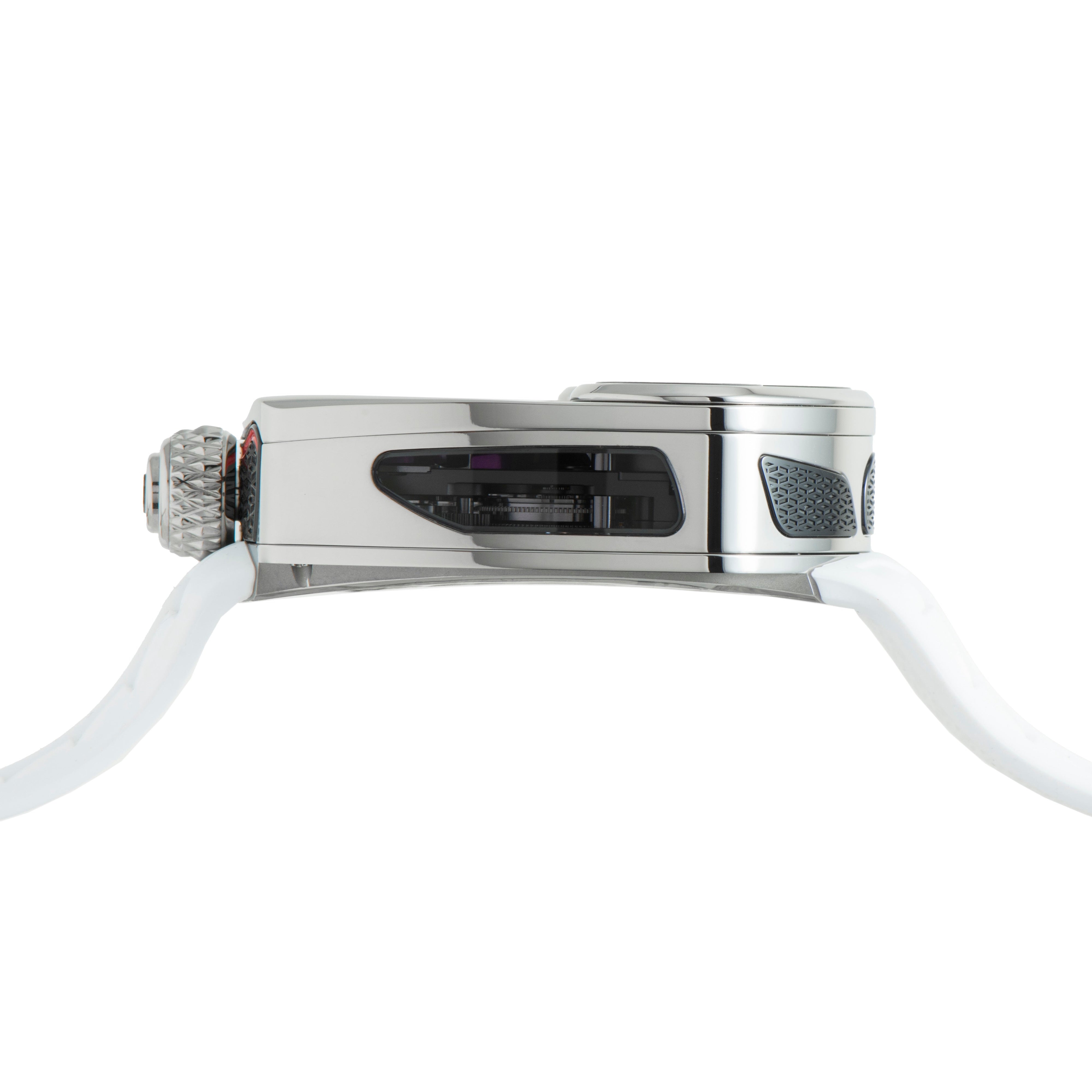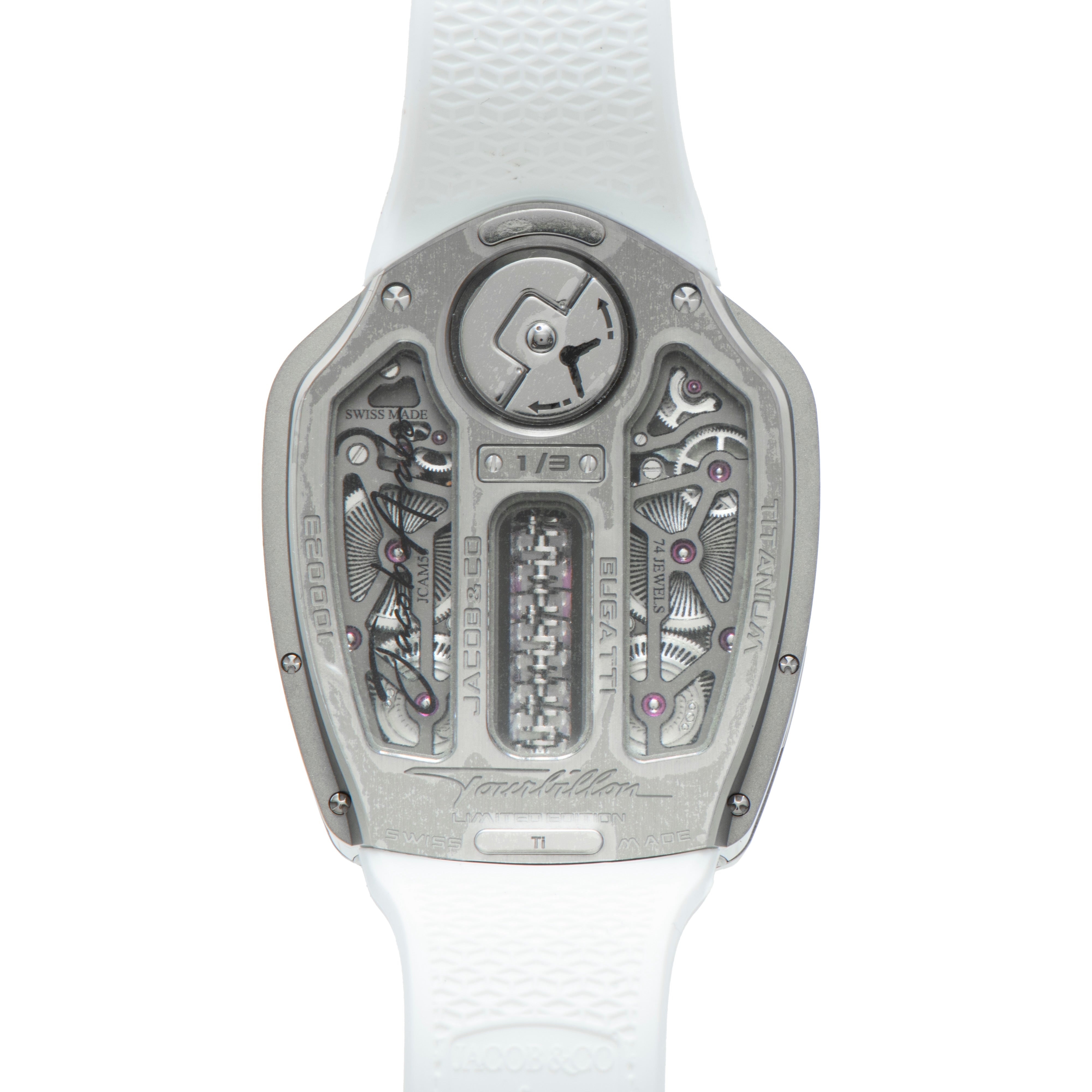 Experience the extraordinary Bugatti Tourbillon, featuring the Manufacture Jacob & Co. Manual Winding JCAM55 in-house caliber with a 30-second flying tourbillon and a captivating “V16 Engine” skirted by sleek purple manifolds with its animation activated by the crown pusher. Crafted from polished titanium, its 52 x 44mm case houses 557 components and 74 jewels, offering an impressive 80-hour power reserve displayed in an automotive style. The Bugatti signed dial showcases striking red and blue accents with rhodium and lacquered hands, while the rubber strap ensures comfort and durability. With anti-reflective sapphire crystal caseback gracing the signature of Jacob Arabo, the founder of Jacob & Co, and 30m water resistance, this timepiece combines cutting-edge mechanics with bold design for a truly exceptional wrist presence.