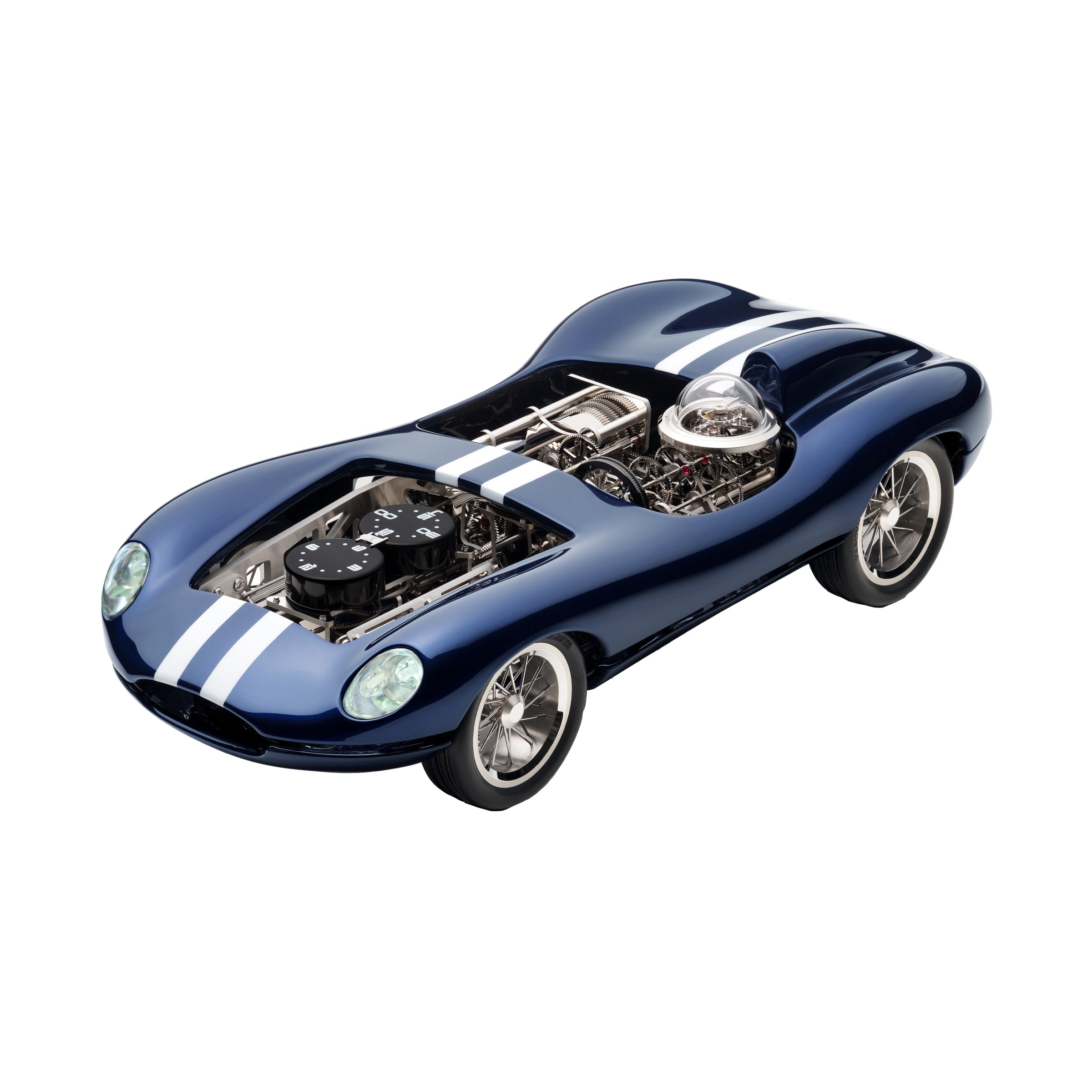 Time Fast II features two independent movements, both with their own power source. The first movement is in the cockpit and is responsible for keeping the time. Hours and minutes are displayed by rotating stainless steel disks on the air filters feeding the dual carburetor banks on top of the engine. The 8-day movement is regulated by a visible 2.5 Hertz escapement in the ‘driver’s helmet’ and powered by a mainspring visible in the passenger’s ‘ seat’.