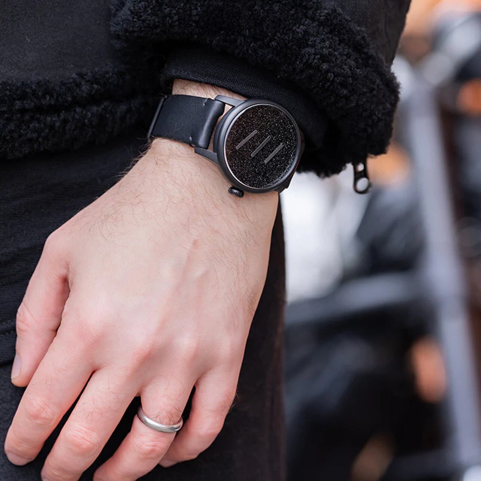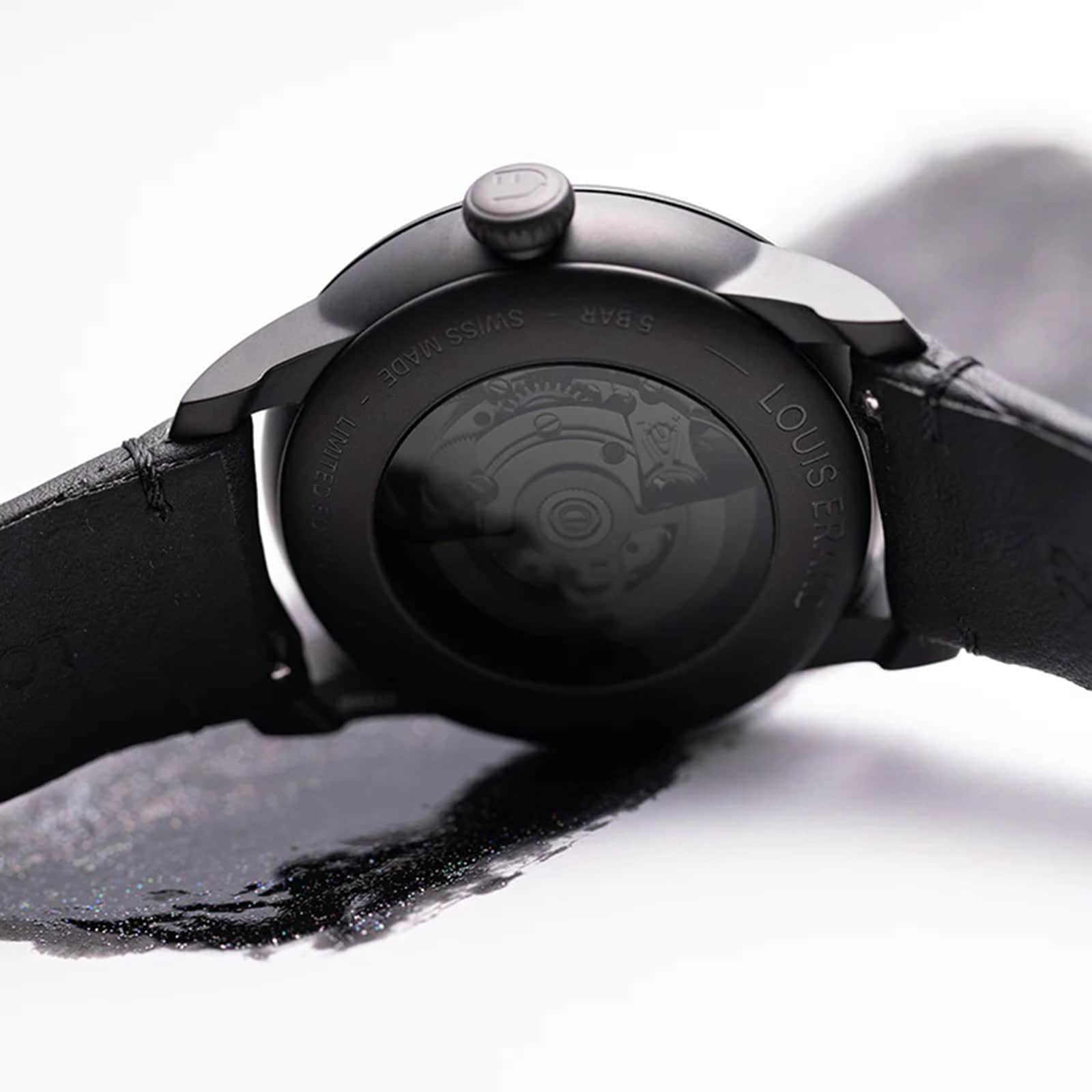 The Louis Erard Le Régulateur x Olivier Mosset is a limited-edition timepiece that seamlessly blends contemporary art with Swi s s watchmaking. Designed in collaboration with Swiss abstract artist Olivier Mosset, this watch features a 42mm sandblasted stai nl ess steel case with a black PVD treatment, creating a matte black finish. The dial is lacquered in shiny black with silver glitt er i nla ys, offering a minimalist aesthetic without logos or indices. The satin-finished hour, minute, and seconds hands are black PVD t reat ed, maintaining the monochromatic theme. Powered by the Sellita SW266-1 automatic movement, it provides a 38-hour powe r reserv e. The watch is water-resistant up to 50 meters and comes with two black Baranil calf leather straps with tone-on-tone stitching a nd black calf leather lining. Limited to 178 pieces, the Le Régulateur Louis Erard x Olivier Mosset is a unique fusion of art and h orology.& lt; /span>
