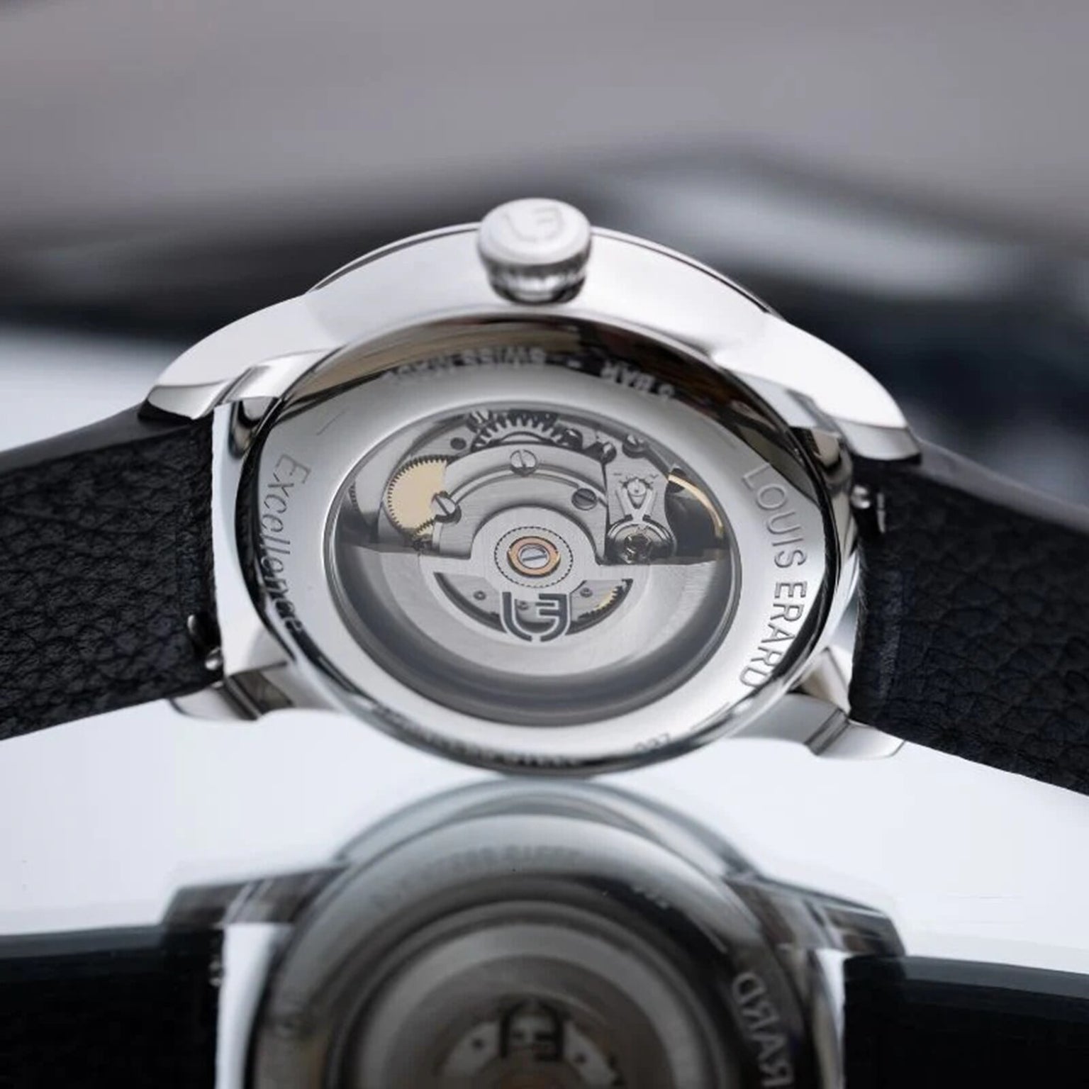 The Excellence Petite Seconde Guilloché showcases a mesmerizing four-part dial with a captivating draped pattern center t hat creates an optical illusion of depth and movement. Surrounded by a panier motif hour circle resembling delicate scales and compl emented by a small seconds subdial at 6 o'clock, this timepiece artfully blends anthracite and blue tones within its elegant 39mm ca se. Every element reflects Louis Erard's commitment to craftsmanship—from the distinctive fir tree hands to the monogrammed crown an d reliable Sellita calibre movement. This accessible luxury watch delivers exceptional artisanal quality at a price point that defie s industry standards.