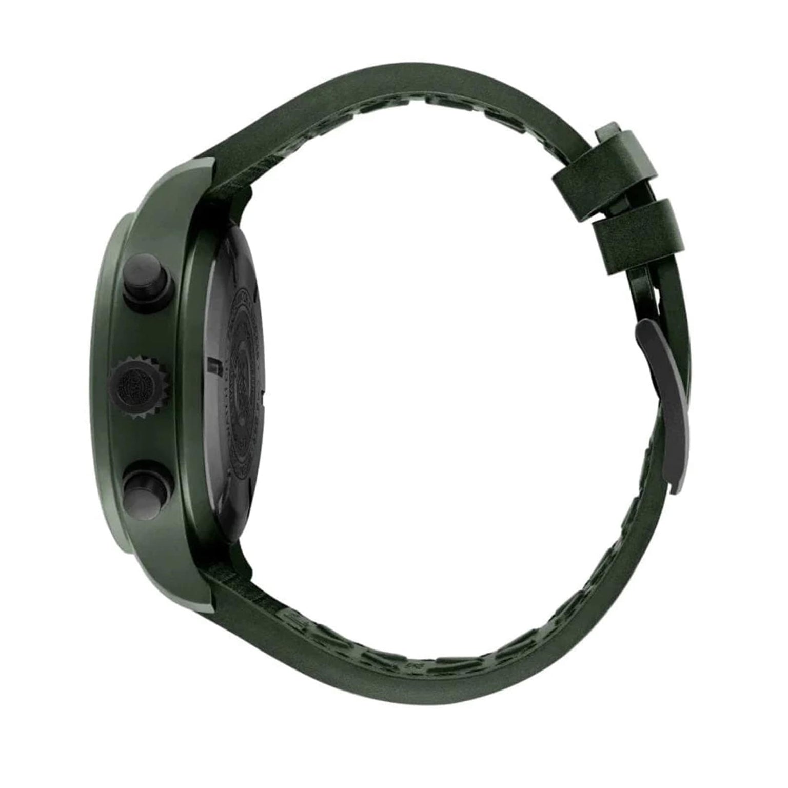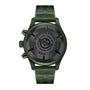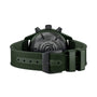 Inspired by TOPGUN pilots' uniforms and the vast forest landscapes they train in, the newest addition to IW C's ceramic portfolio is the dark green "Woodland" color. This sophisticated color is achieved through a unique manufacturing proces s, resulting in a monochromatic design with a dark green dial and black hands. The pushers, crown, and case back feature the TOP GUN logo and are made of Ceratanium®, a light and durable material. Inside the 44-millimeter ceramic case, the 69380 calibre movement i s at work, with a day and date display at 3 o'clock. For added protection, there is a soft-iron inner case to shield the movement fr om magnetic fields. The "Woodland" TOP GUN chronograph is paired with a green rubber strap with textile inlay, perfectly complementi ng the case.