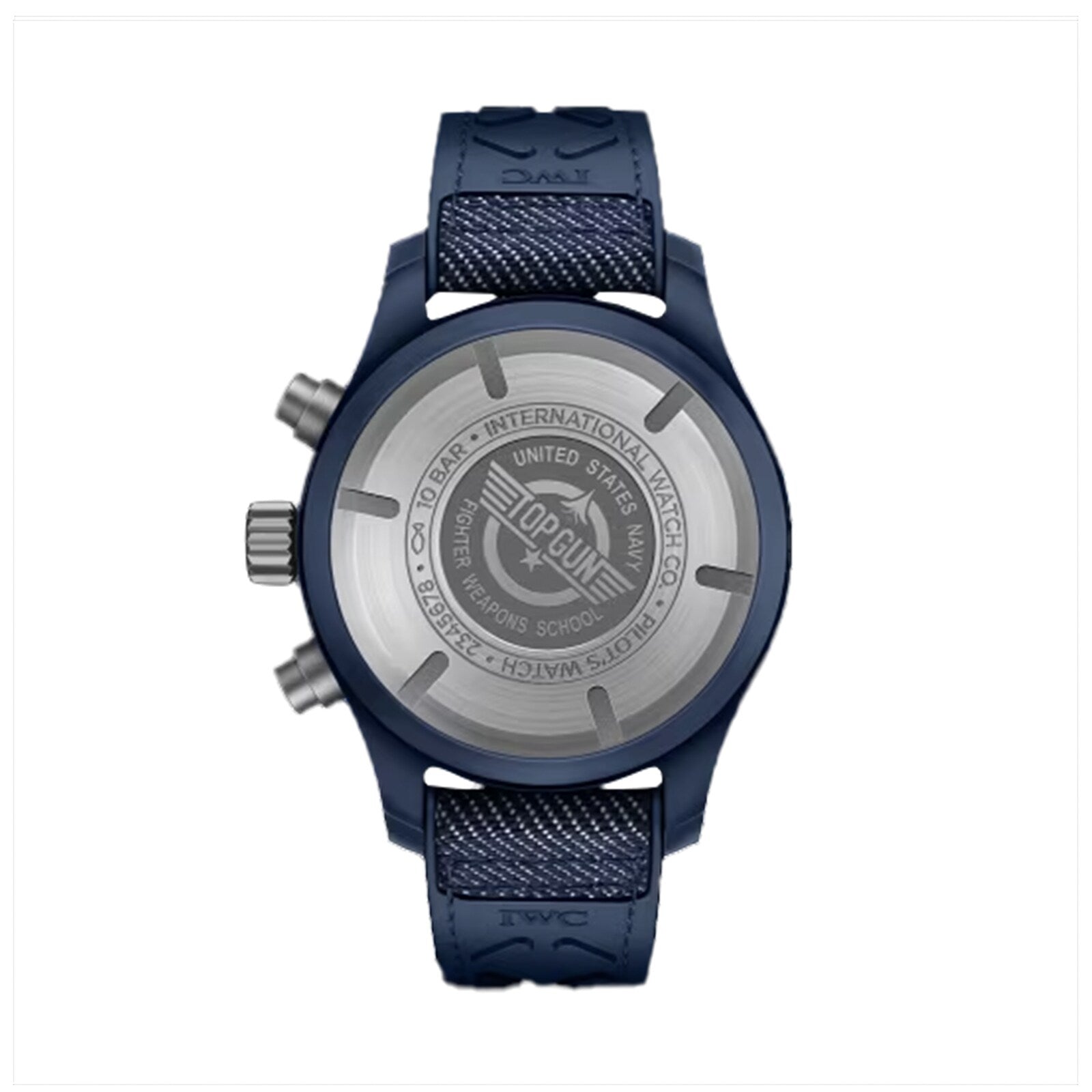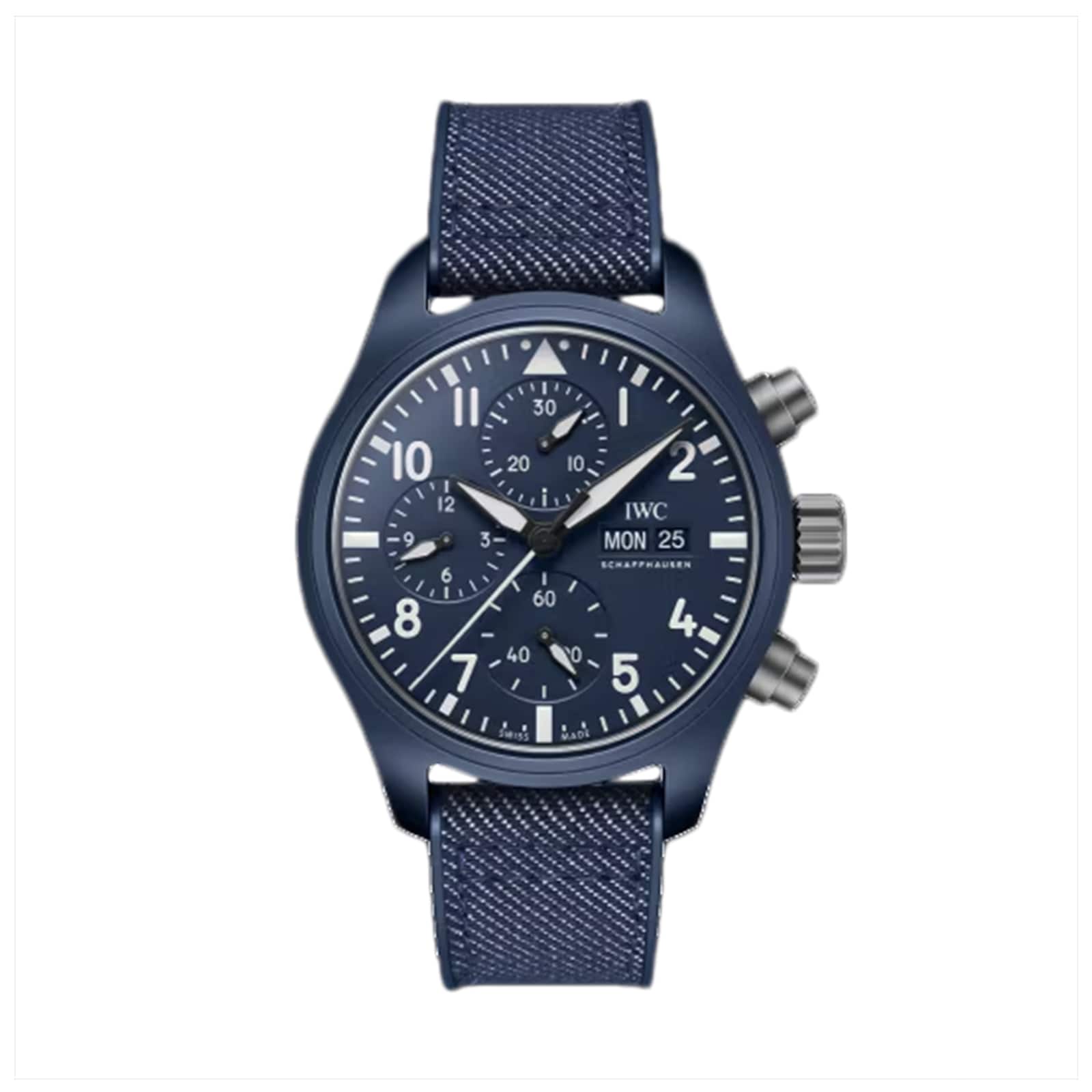 Pilot Chronograph - reimagining an iconic design Housed in a 41.9mm blue ceramic case secured with a blue rubber strap with a textile inlay Advanced blue dial with high contrast white details Driven by an IWC-manufactured 69380 calibre automatic self- winding movement Top Gun engraved case back FOR THE MODERN EXPLORER A quintessential tool for the modern-day explorer, the Pilot collection brings together innovative engineering and an iconic Schaffhausen design. A versatile sports range, this collection consists of reliable timepieces that are ready to become a distinguished companion. Made from robust and exquisite materials, this 41.9mm Top Gun model provides exceptional navigation and dependability for aviators. TOP GUN EDITION This 41.9mm model is housed in a blue ceramic case secured with a blue rubber strap with a blue textile inlay for a contemporary aesthetic. The bold blue dial plays host to contrasting hands and Arabic numerals for clear and concise timekeeping. Chronograph functionality with hour, minute, and second accuracy, along with a date and day display at 3 o'clock, further elevates this timepiece. This high performance model is driven with flawless precision by the IWC-manufactured 69380 calibre automatic movement equipped with a 46-hour power reserve. Water resistance up to 10 bar (100 metres) enhances performance while a soft-iron inner case provides protection against magnetic fields. The back of the case is engraved with the Top Gun logo.