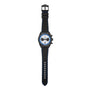 The TUDOR Black Bay Chrono is a black wristwatch with blue accents, a white and blue dial, and a black band featuring blue stitching, displayed flat.