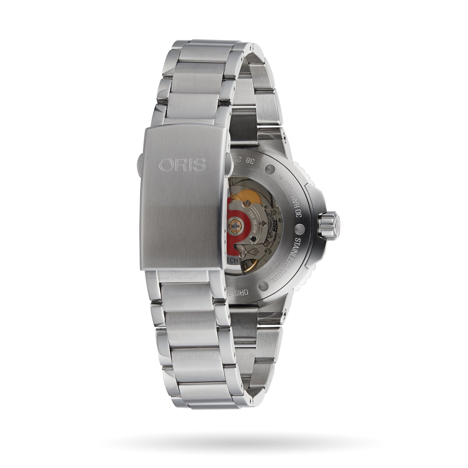 The Oris Aquis Date Relief watch features a stainless steel clasp and a transparent case back that reveals the movement.