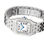 The Panthère de Cartier by Cartier is a silver wristwatch featuring a square face, Roman numeral markers, brilliant cut diamond bezel, and metal link bracelet—an iconic jewellery watch shown on a white background.