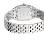 The Panthère de Cartier by Cartier is a silver stainless steel jewelry watch with a square face, Roman numerals, brilliant-cut diamond bezel, blue crown, and metal band with deployment clasp marked Stainless Steel and Swiss Made.