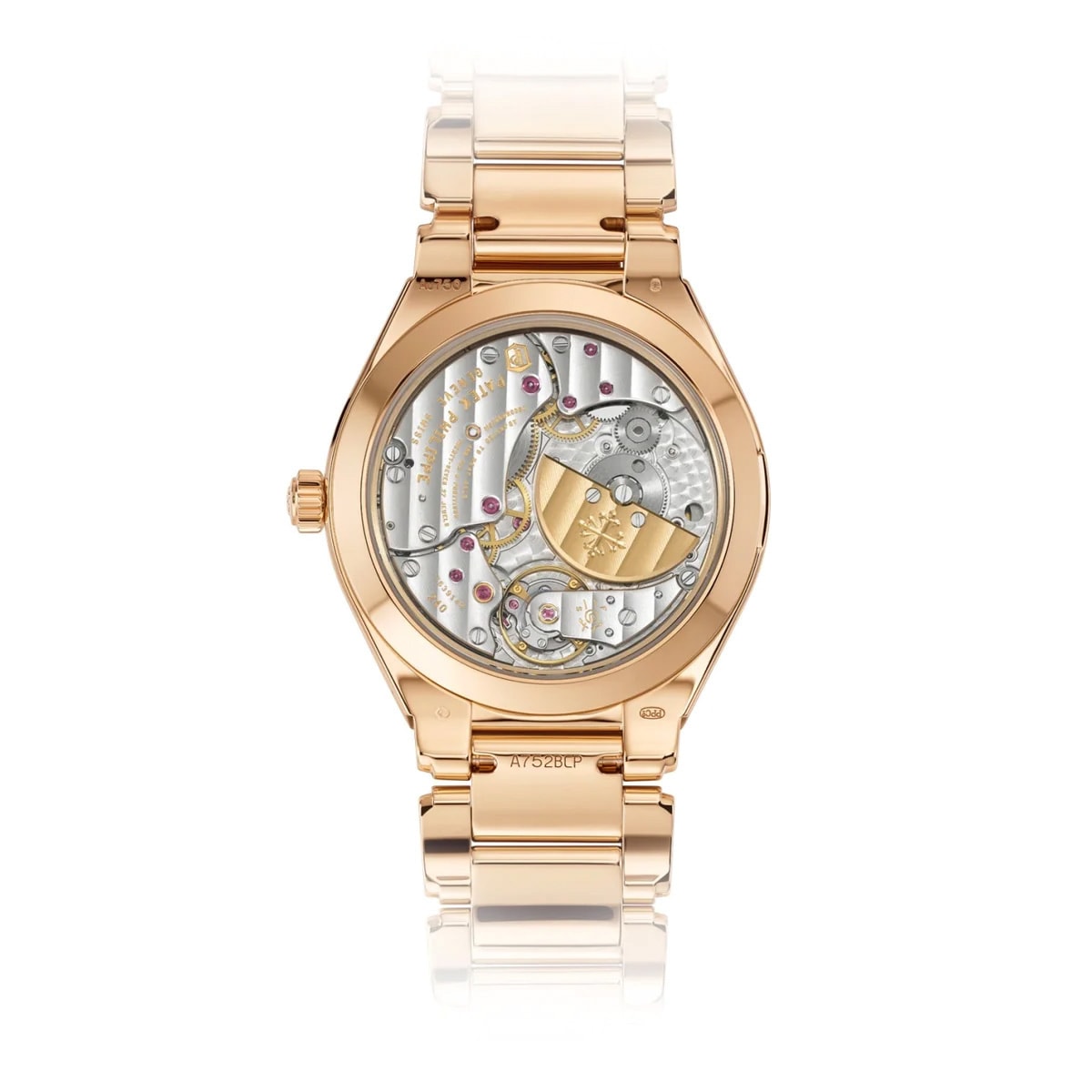 Back view of the Patek Philippe Twenty~4 7340/1R-010, showcasing its intricate mechanical movement and gears through a transparent case.