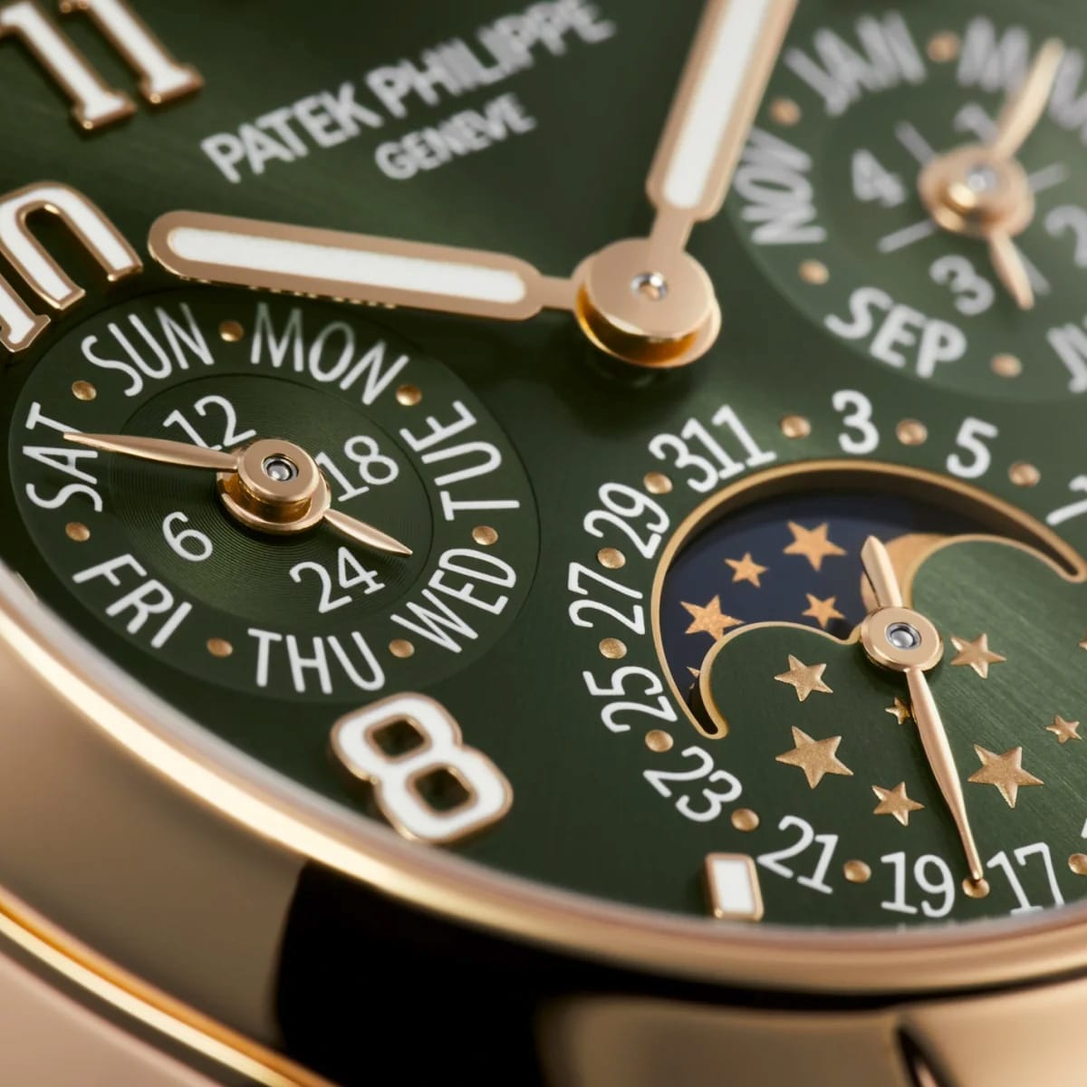 Close-up of a green Patek Philippe Twenty~4 7340/1R-010 watch face with gold hands, numerals, calendar, and moon phase display.