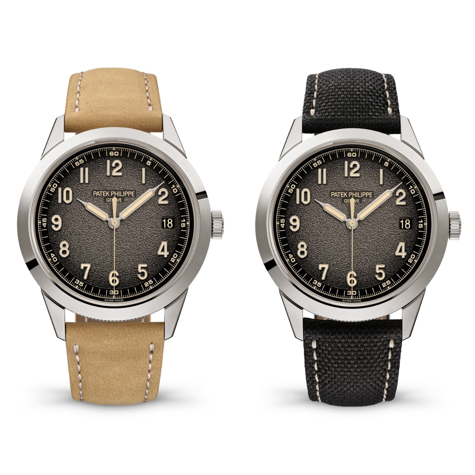 Two Patek Philippe Calatrava 5226G-001 watches with black dials: one with a tan strap and one with a black strap.