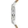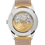 Side view of the Patek Philippe Calatrava 5226G-001, featuring a silver case with a textured bezel and a light brown leather strap.
