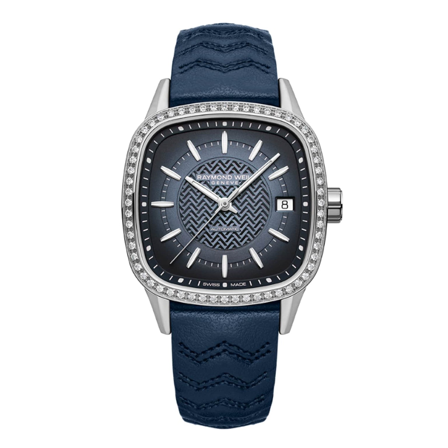 The next evolution of the freelancer automatic collection is a new interpretation of the form watch, that elegantly transcends convention. This model has been reimagined for the modern individual, fusing a cushion-shaped design with signature brand details that radiate contemporary sophistication. Measuring a 34.5 x 34.5 mm diameter, the freelancer ladies automatic has a square, cushion-shaped housing and features an automatic Swiss-made movement, with a 41 hours power reserve, ideally suited to daily wear. This model features luminescent hour and minute hands with matching indexes, a fine centre seconds hand and a date indication at 3 o’clock. The dial’s gradient blue draws the eye towards the center, where a captivating W-shaped motif, as a nod to the RAYMOND WEIL brand, creates subtle shades that mesmerize the wearer. Perfect balance of tradition and modernity, the freelancer automatic collection showcases RAYMOND WEIL’s unwavering dedication to craftsmanship and artistic expression.