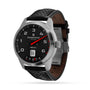 The Reservoir GT Tour wristwatch features a black leather strap, white numerals, and a red accent on the dial.