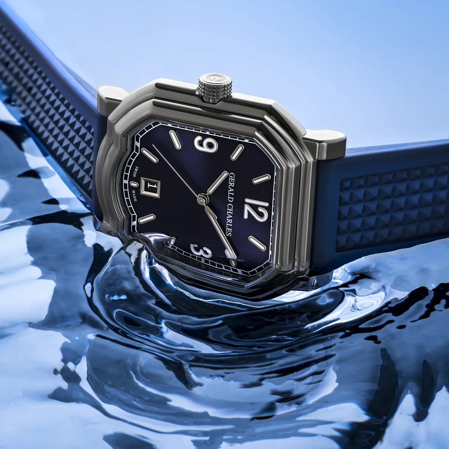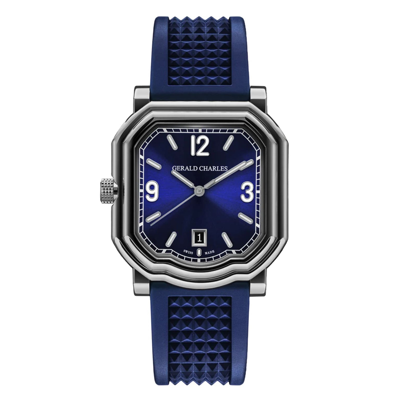The Gerald Charles Maestro GC Sport features a blue dial with bold numerals at 12 and 3, a date window at 6, and a blue textured vulcanized rubber strap.