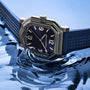 The Gerald Charles Maestro GC Sport watch, featuring a blue vulcanized rubber strap and silver case, rests partially submerged in rippling water and displays the time 1:00.