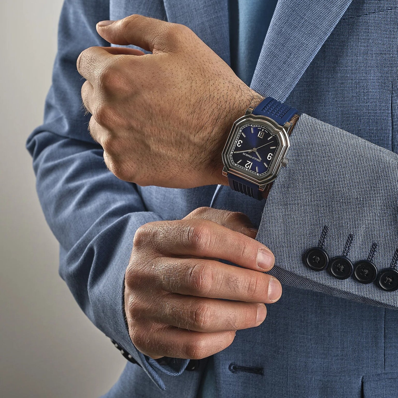 A man in a blue suit with the Gerald Charles Maestro GC Sport on his left wrist