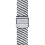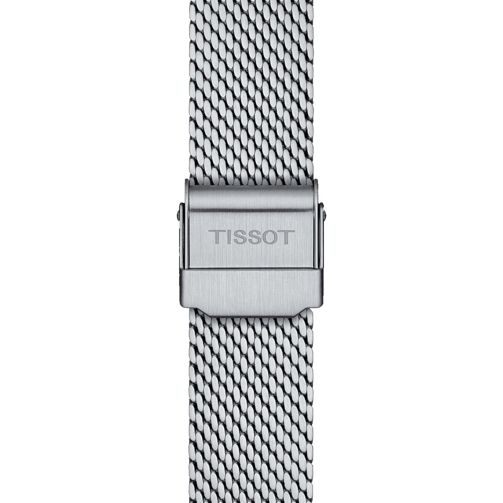 Close-up of the Tissot Everytimes silver mesh metal strap, featuring a clasp engraved with TISSOT, highlighting the refined design on a white background.