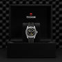 A TUDOR Black Bay Pro wristwatch with a black strap is displayed in a black TUDOR-branded box.