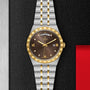The TUDOR Royal wristwatch features a brown dial, gold and silver bracelet, automatic movement, day and date display, Roman numerals, and diamond hour markers.