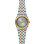 The TUDOR Royal combines sport-chic style and elegance with a stainless steel and gold band, gold bezel, silver dial, Roman numerals, diamond markers, and a date window at 3 oclock.