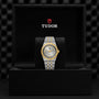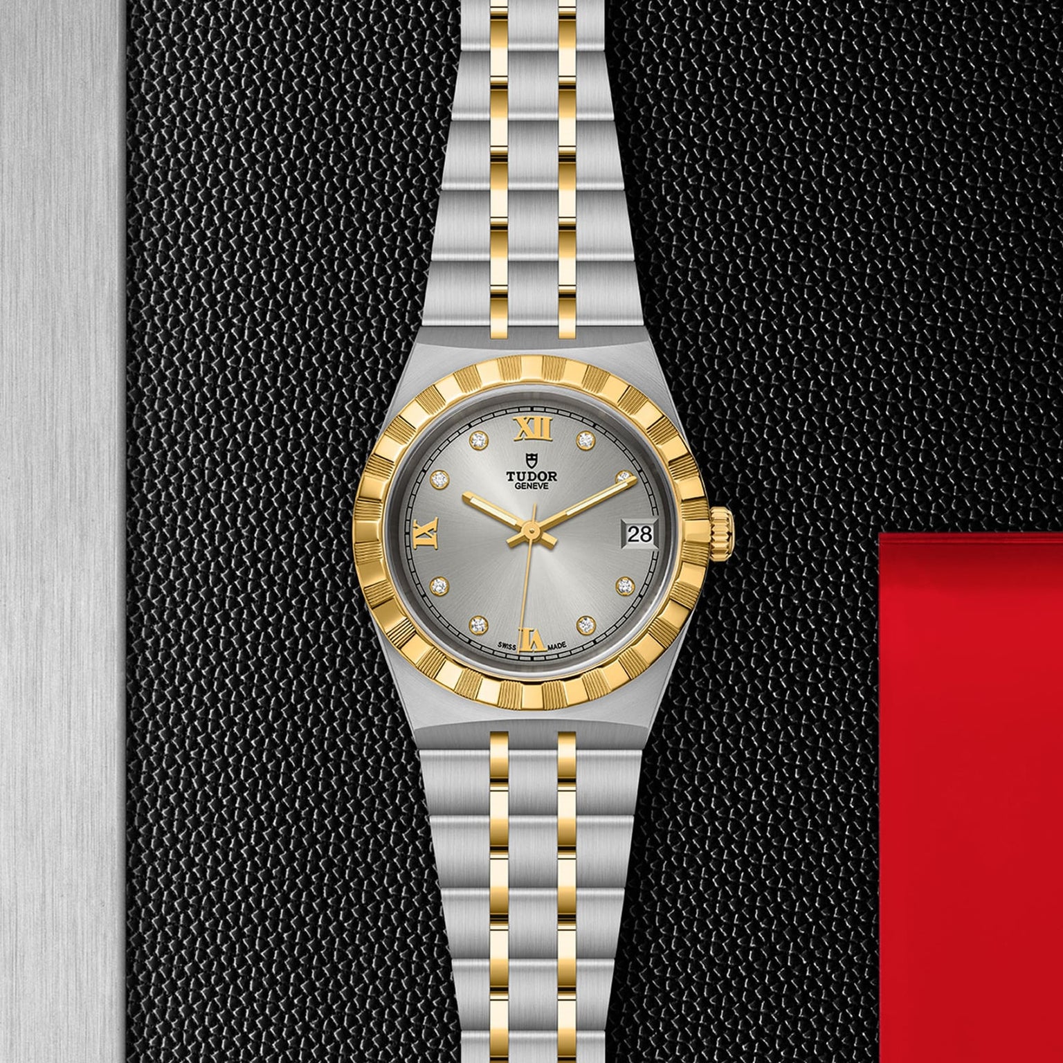 The TUDOR Royal is a two-tone stainless steel and gold wristwatch with a gold bezel, silver dial, diamond hour markers, Roman numerals, and a date at 3 o’clock—an automatic sport-chic watch for any occasion.