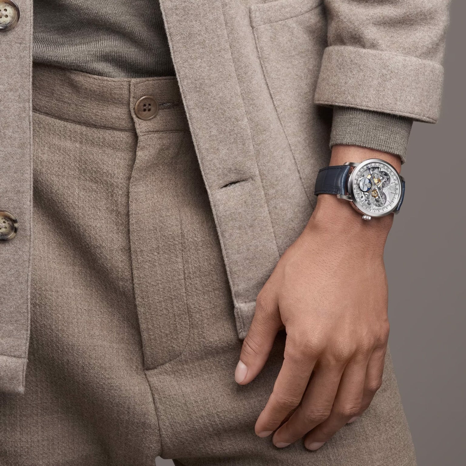 The Traditionnelle Complete calendar watch, entirely sculpted in 950 platinum embodies the Maison's Quest with its avant-garde aesthetics, mechanical sophistication and display of creative expertise. Produced for Vacheron Constantin’s 270th anniversary, this 370-piece limited edition presents an openface dial with a hand-guilloché Maltese cross pattern. A discreet anniversary signature and a “côte unique” finish adorn the self-winding movement. The complete calendar and precision moon phase exude contemporary style, while upholding the Traditionnelle Collection’s stylistic tenets with a stepped round case and lugs, slender bezel and a fluted caseback, railway-type minute track, Dauphine-type hour and minute hands.