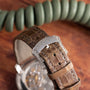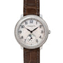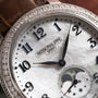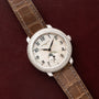 This piece has applied white gold Arabic numerals, with a subsidiary seconds hand and moonphase at 6. This piece is set on a brown alligator strap and completed with a white gold pin buckle with diamonds.