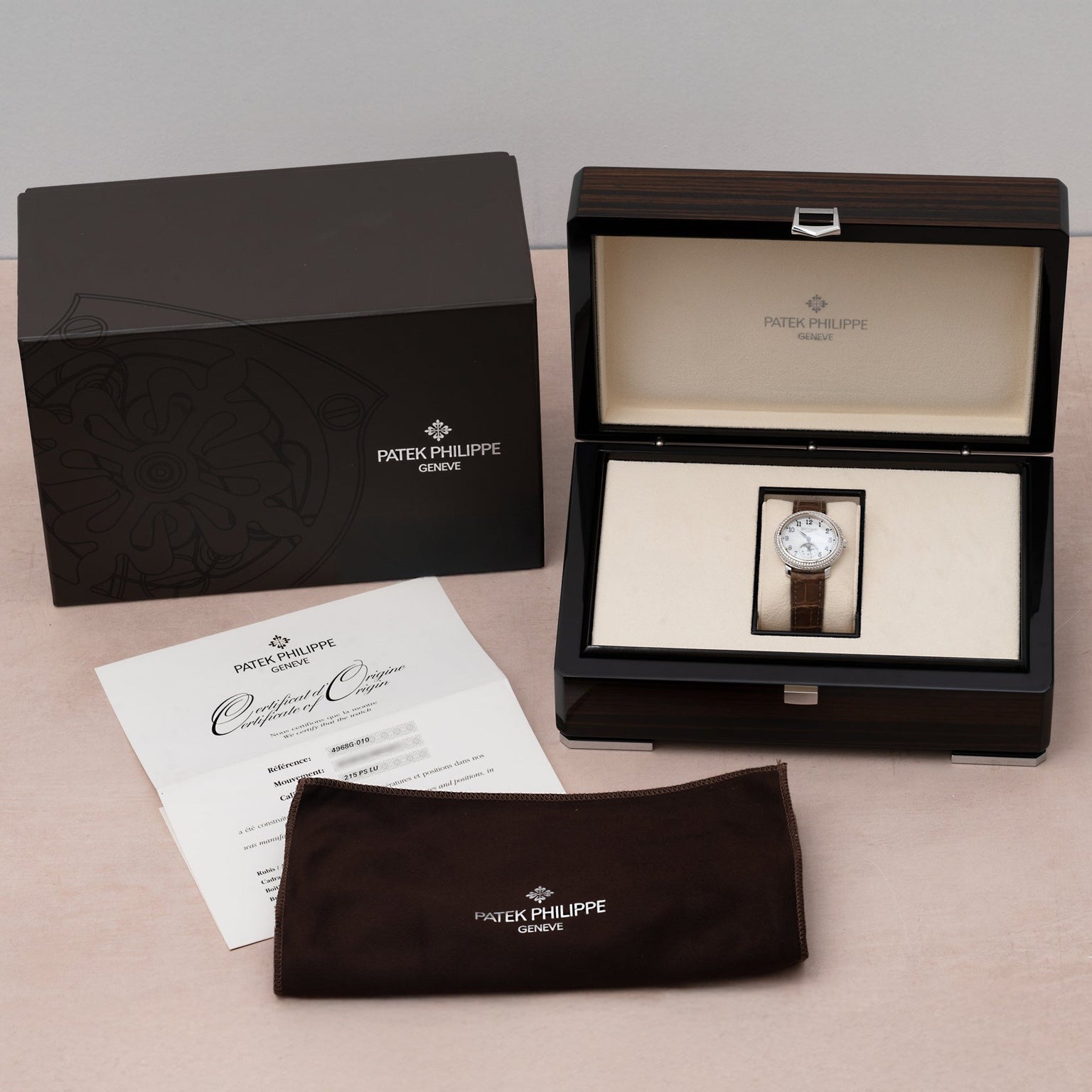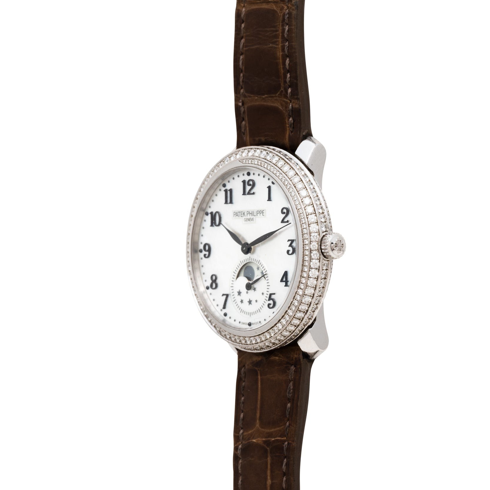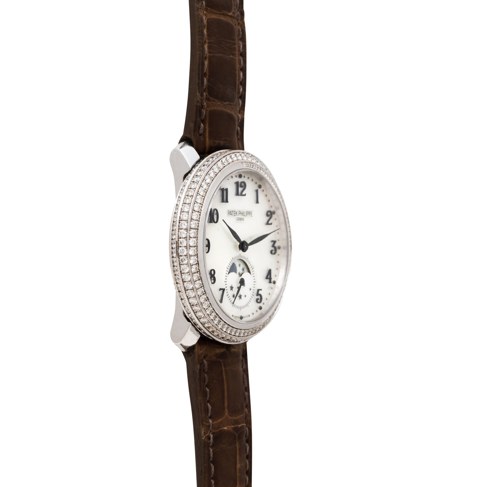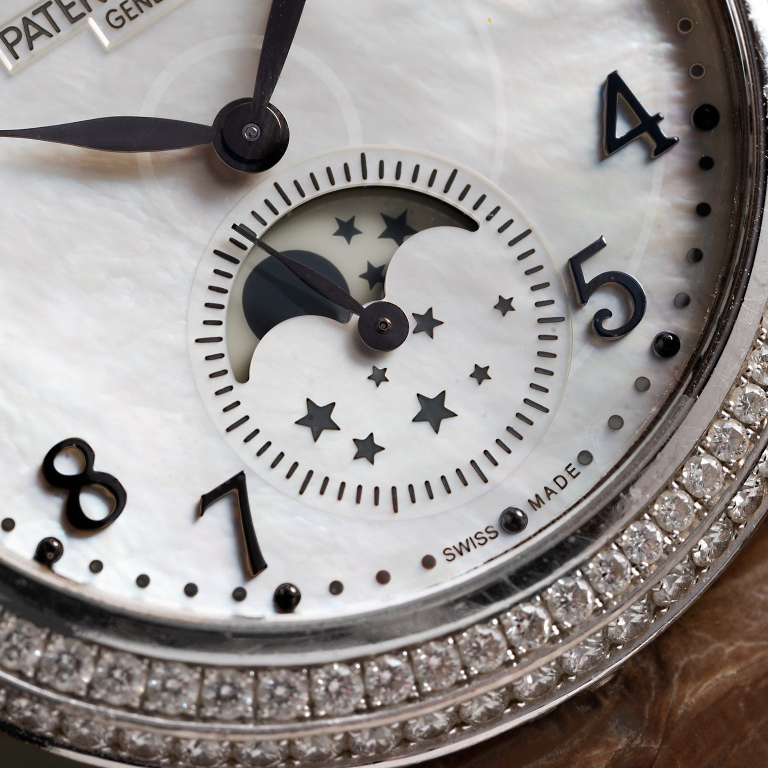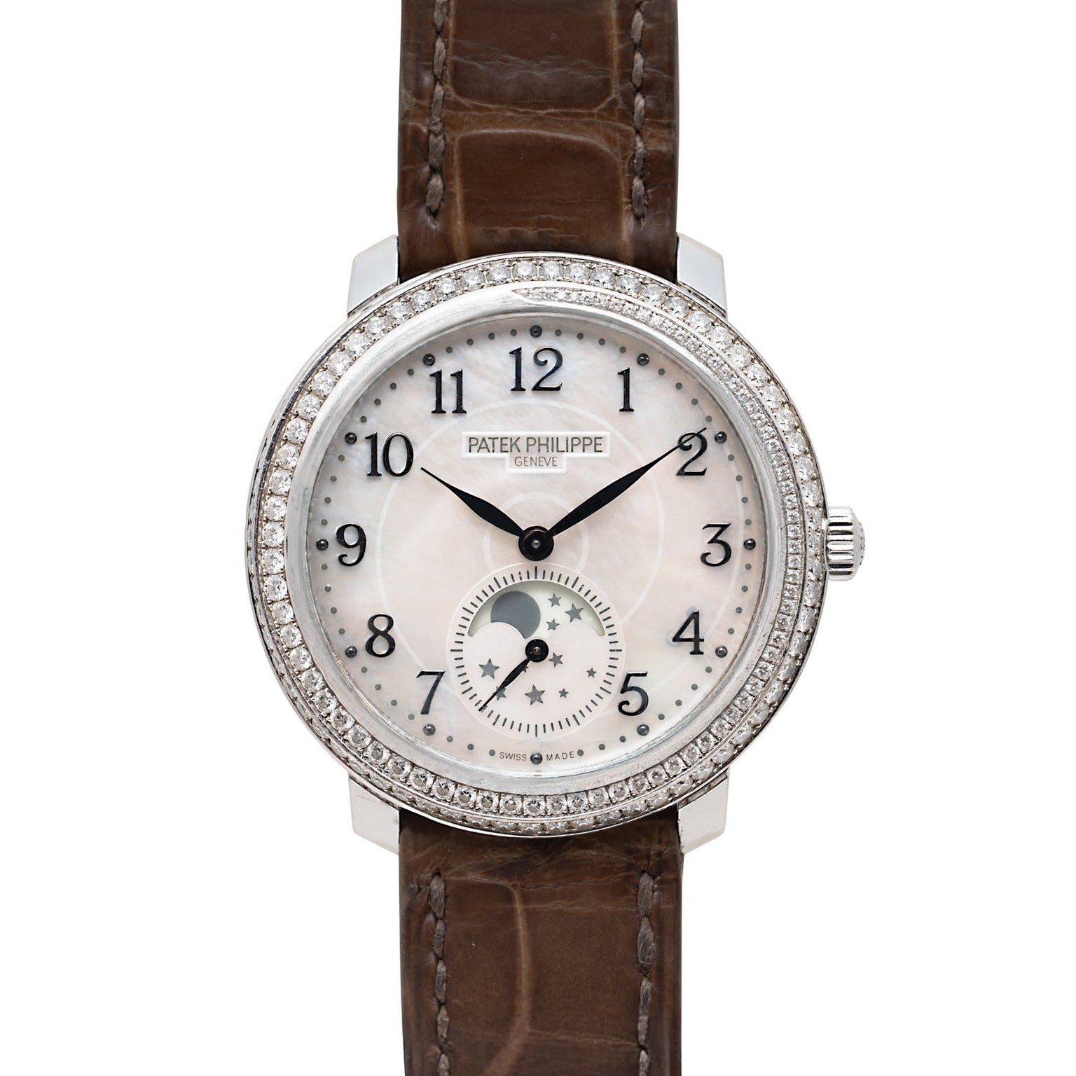 The Annual Calendar was the start of the "complications" collection. This piece is a modern rare extension of the collection, designed for ladies. A Reference 4968G-010, this piece features a beautiful mother of pearl dial with a swirl motif that is carried through to the bezel which flaunts a diamond spiral setting.