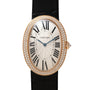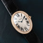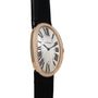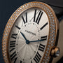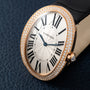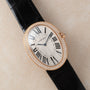The particular Baignoire dates to circa the 2010s and features an oval 32mm 18K rose gold case with a sapphire crystal, factory diamond- set bezel, a silver guilloche dial, painted black 'Roman' indices and a matching blued-steel 'sword' handset. To complete the package, this piece is fitted with a signed black alligator leather strap with a signed rose gold deployant clasp.