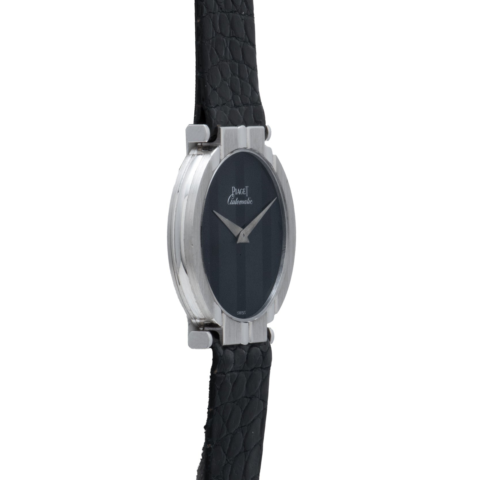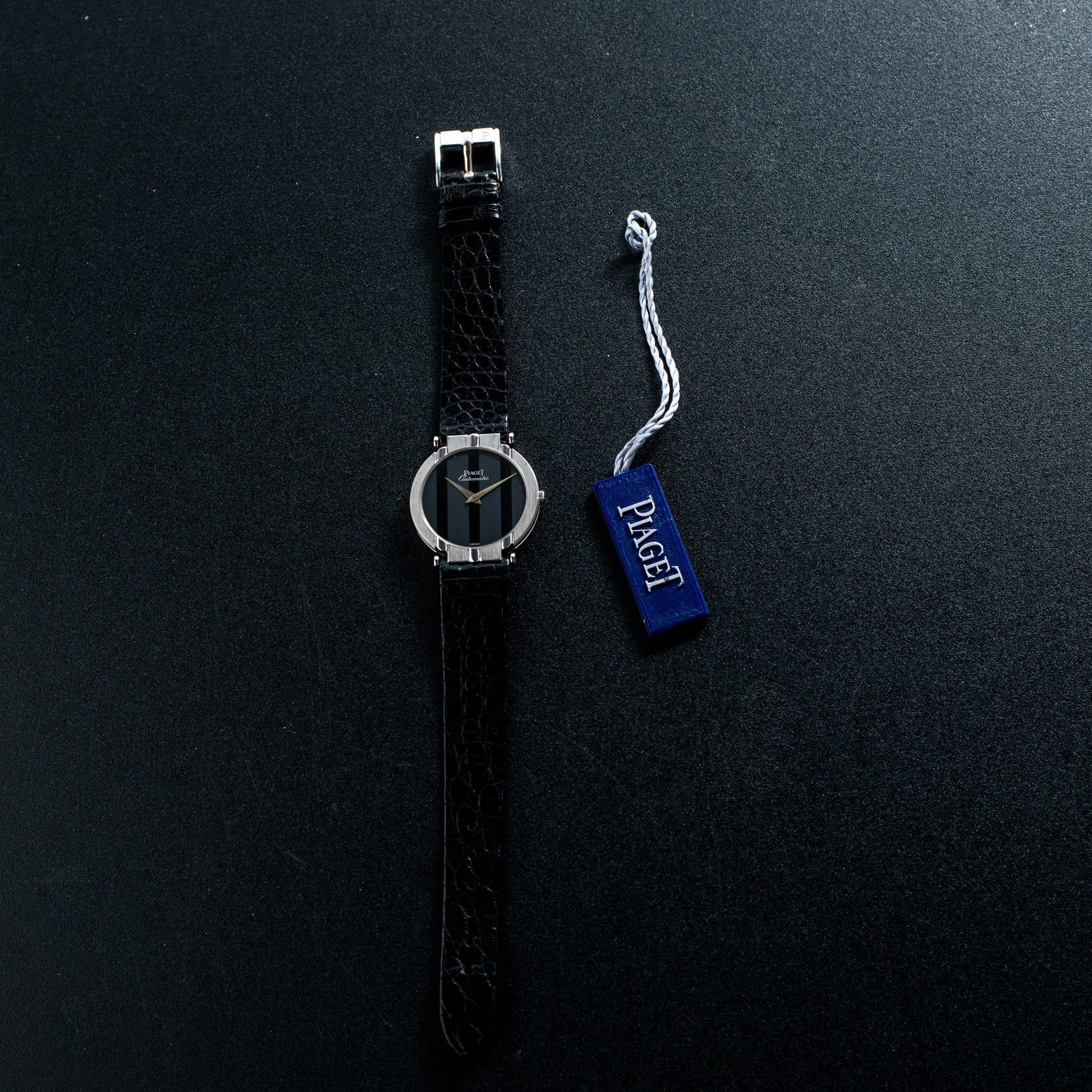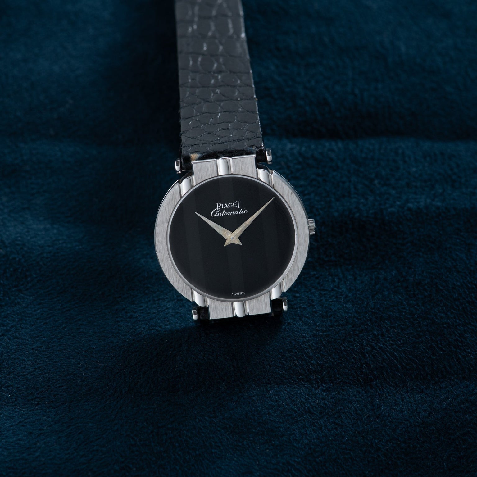 Dating to the 1980s, this particular Piaget piece, a Reference 5273, d r ew on that 70s language and offers a slightly darker-and-broodier 80s vibe! It is housed in a 27mm, 18k white gold case that features a triple vertical stripe finish that seamlessly translates into the dial, which displays a matte and gloss pinstripe pattern. In true Piaget fashion, the dial features a matching 'dauphine' handset and the stylized Piaget signature.