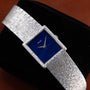 Hailing from that era, this particular Piaget - a Reference 9120 - is housed in a 23mm x 26mm 18k white gold case that features a beautiful ‘lapis lazuli’ dial. Its bezel features a ‘bark’ finish, a winding crown and a dial that houses a matching ‘dauphine’ handset and a stylized Piaget signature.