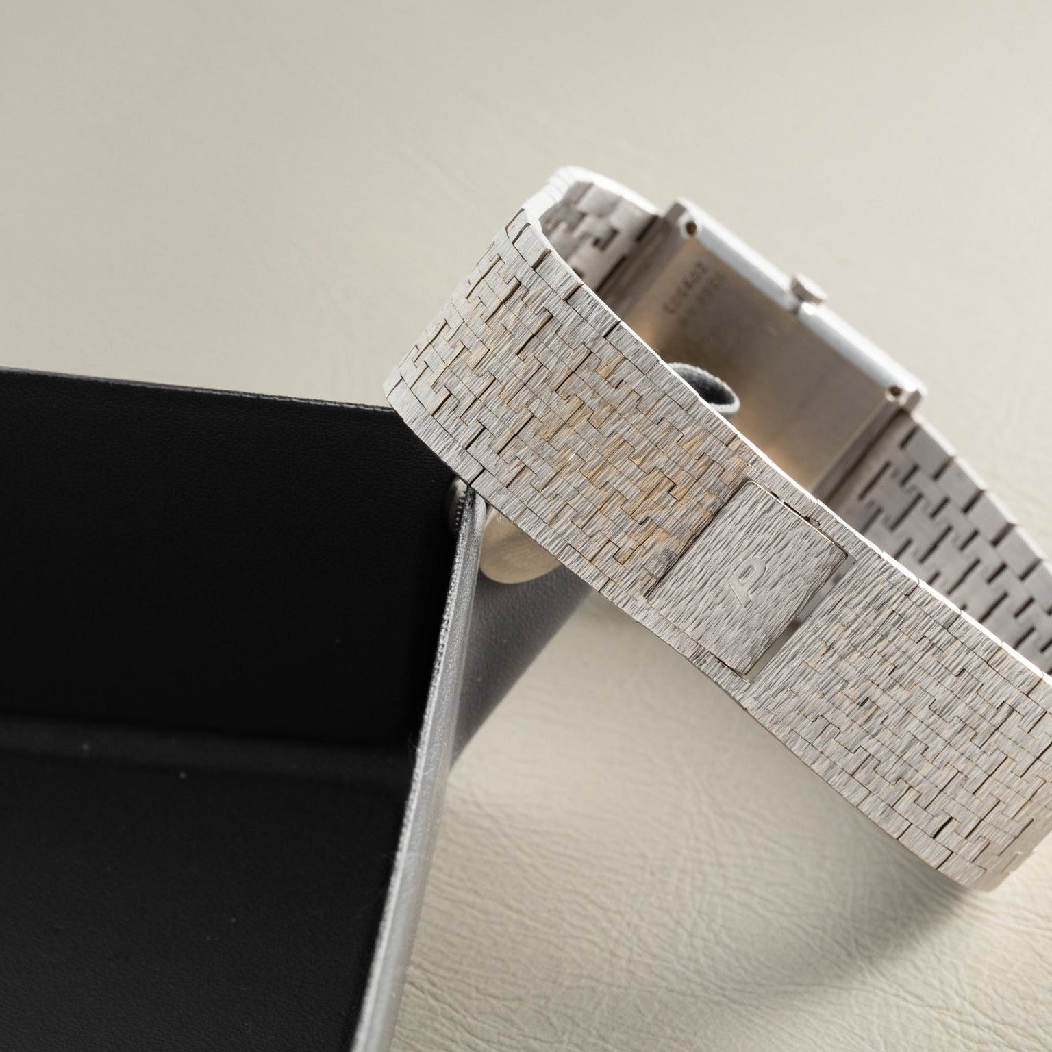 Arguably just as stunning as the dial and case, this Piaget is fitted to an integrated white gold bracelet with a matching ‘bark’ finish and a signed clasp.